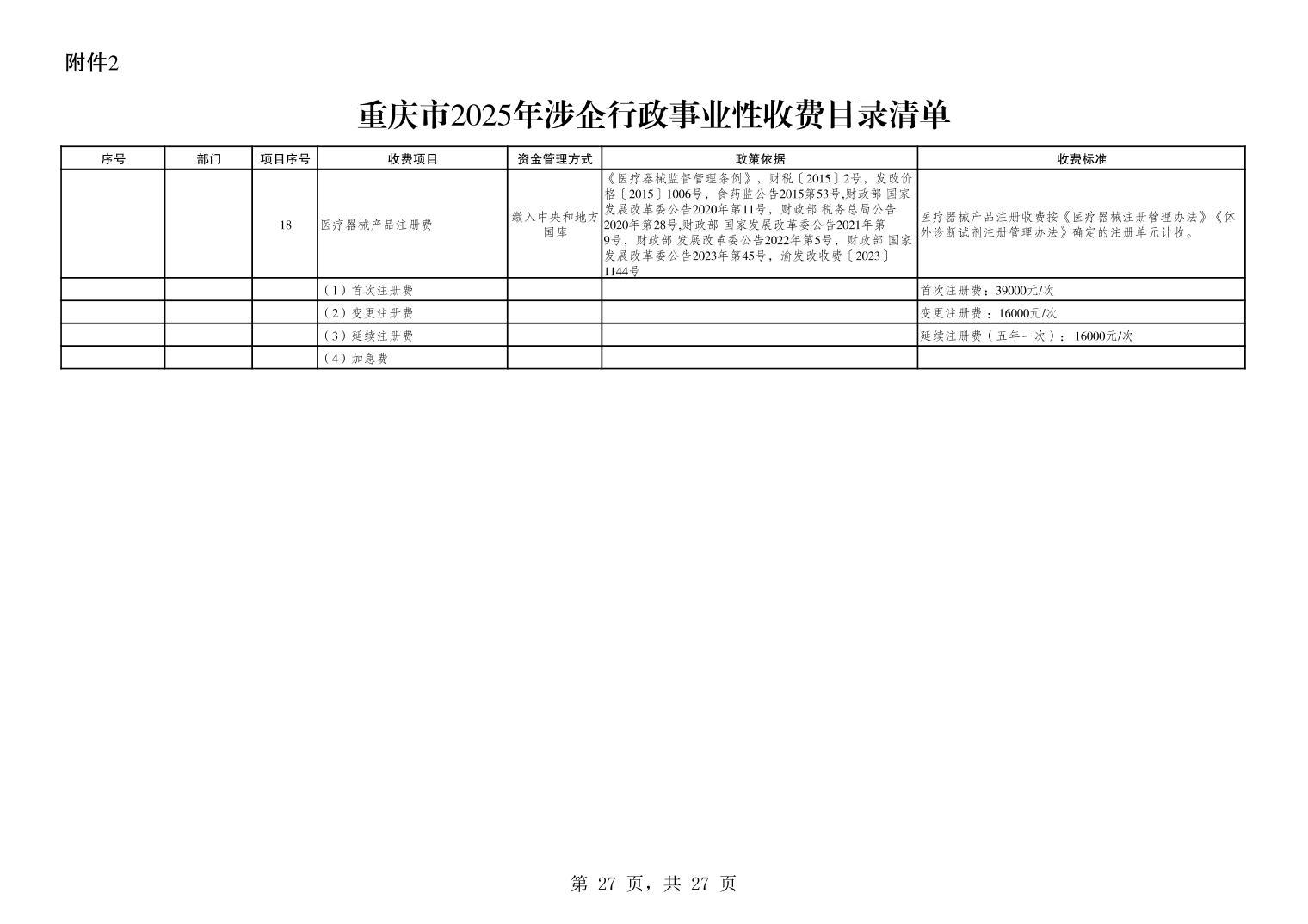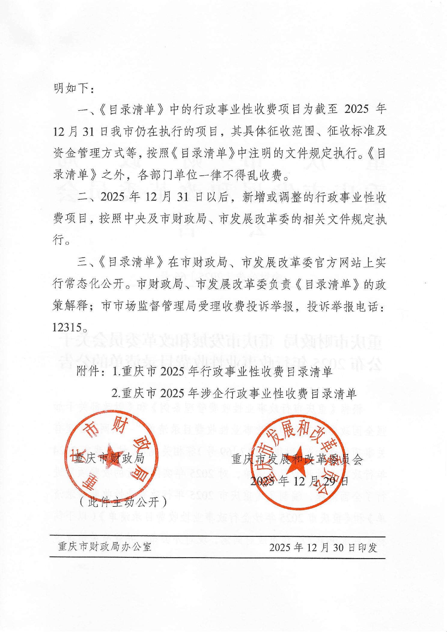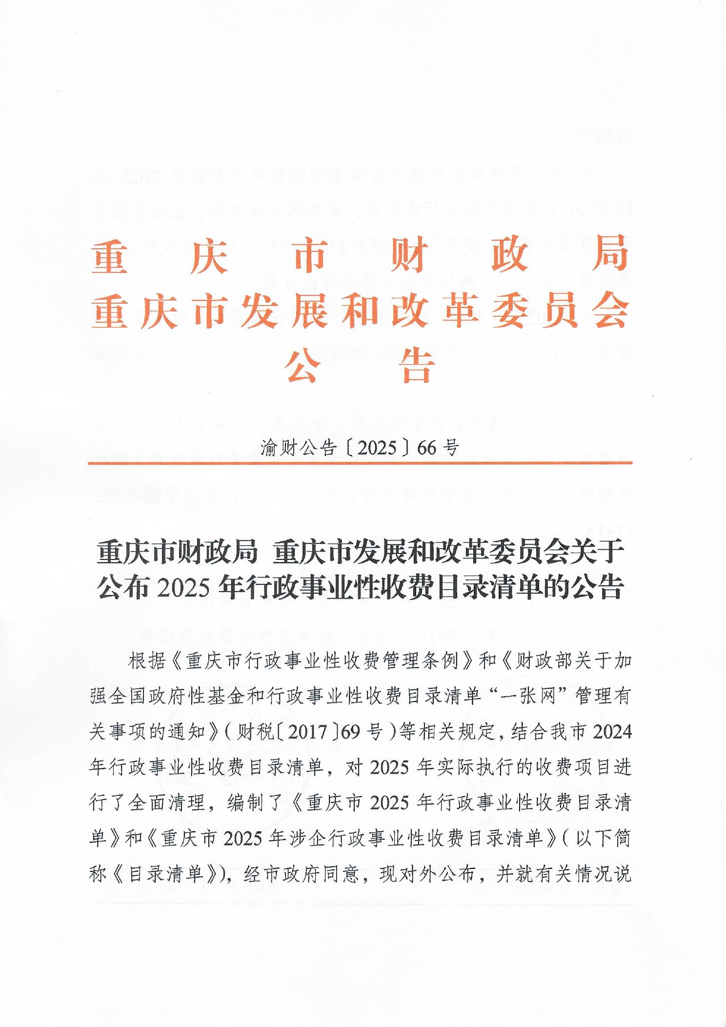 重庆市财政局 重庆市发展和改革委员会关于公布2025年行政事业性收费目录清单的公告