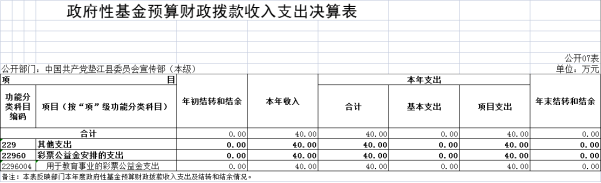 2022年度政府性基金预算财政拨款年初结转结余0万元,年末结转结余0万元。本年收入40万元,较上年决算数增加22万元,增长122.2%,主要原因是用于乡村学校少年宫建设。本年支出40万元,较上年决算数增加22万元,增长122.2%,主要原因是2022年新增3所复兴少年宫。