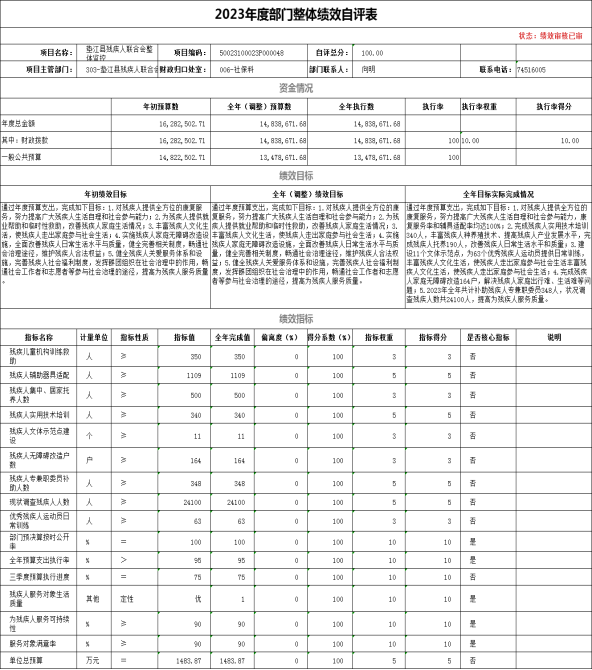1.总体情况。2023年度收入总计1484.06万元,支出总计1484.06万元。收支较上年决算数增加70.81万元,增长5.01%,主要原因是本年度残疾人事业发展经费增加,上级专项资金增加。