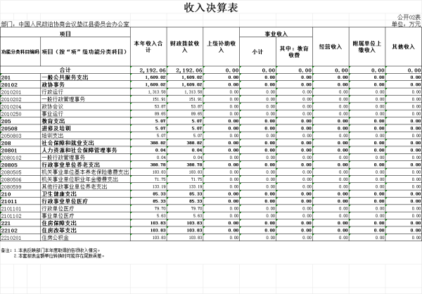 2.收入情况。2024年度收入合计2,192.06万元,较上年决算数减少296.60万元,下降11.9%,主要原因是本年度多名职工退休,对应的预算收入大幅减少,同时,本单位压缩了部分项目开支,加之2023年补发了前期所欠绩效奖金等。其中:财政拨款收入2,192.06万元,占100.0%。此外,使用非财政拨款结余0万元,年初结转和结余0.00万元。