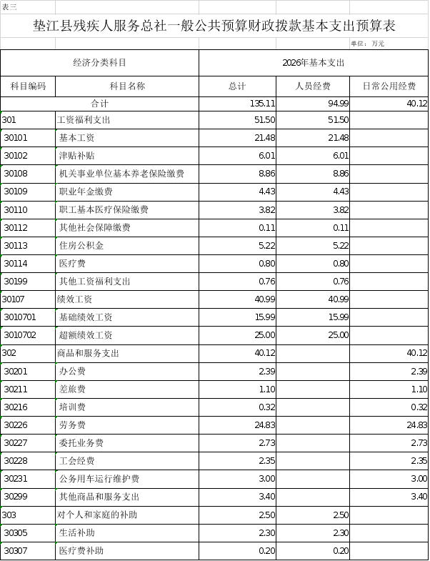 3.垫江县残疾人服务总社一般公共预算财政拨款基本支出预算表