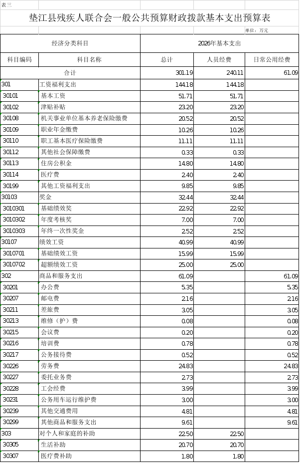 3.垫江县残疾人联合会一般公共预算财政拨款基本支出预算表