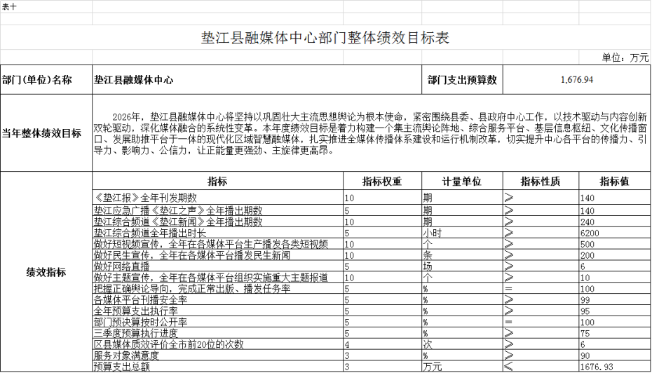 10.垫江县融媒体中心2026年部门和单位整体绩效目标表