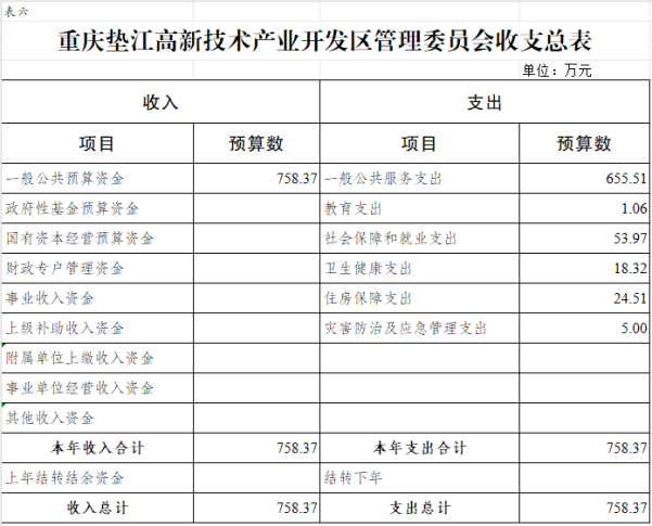 6.重庆垫江高新技术产业开发区管理委员会部门收支总表