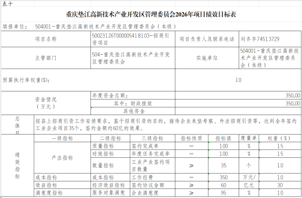 10.重庆垫江高新技术产业开发区管理委员会2026年项目绩效目标表