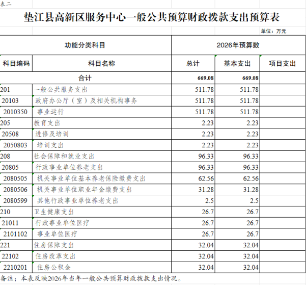 (二)支出预算:2026年年初预算数669.08万元,其中:一般公共服务支出511.78万元,教育支出2.23万元,社会保障和就业支出96.33万元,卫生健康支出26.70万元,住房保障支出32.04万元;支出较去年增加54.22万元,主要是政策性增员增资。
