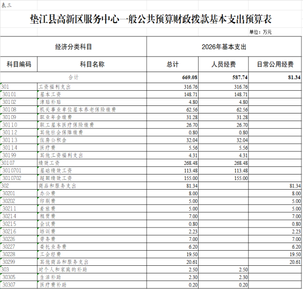 3.垫江县高新区服务中心一般公共预算财政拨款基本支出预算表