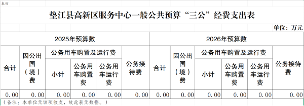 2026年“三公”经费预算0万元,比2025年减少0万元。其中:因公出国(境)费用0万元,比2025年减少0万元,主要原因是未发生因公出国(境)费用;公务接待费0万元,比2025年减少0万元,主要原因是未发生公务接待费;公务用车运行维护费0万元,比2025年减少0万元,主要原因未发生公务用车运行维护费;公务用车购置费0万元,比2025年减少0万元;主要原因是未发生公务用车购置费费。