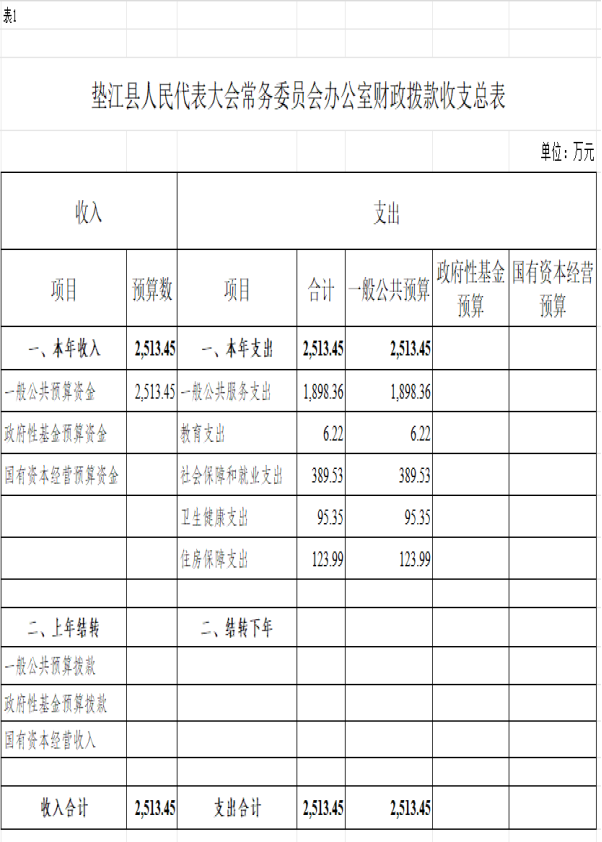 附表:1.垫江县人民代表大会常务委员会办公室财政拨款收支总表