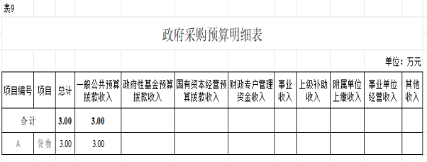 (二)政府采购情况。所属各预算单位政府采购预算总额3.00万元:政府采购货物预算3.00万元、政府采购工程预算0万元、政府采购服务预算0万元;其中一般公共预算拨款政府采购3.00万元:政府采购货物预算3.00万元、政府采购工程预算0万元、政府采购服务预算0万元。
