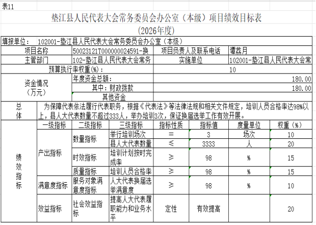 11.垫江县人民代表大会常务委员会办公室2026年项目绩效目标表