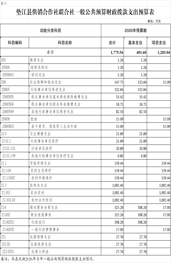 2.垫江县供销合作社联合社一般公共预算财政拨款支出预算表