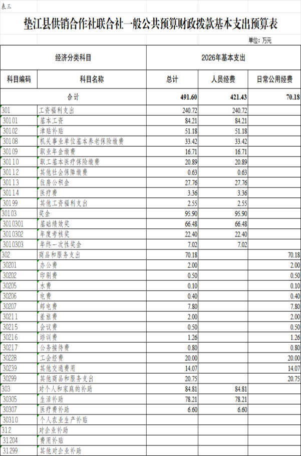 3.垫江县供销合作社联合社一般公共预算财政拨款基本支出预算表