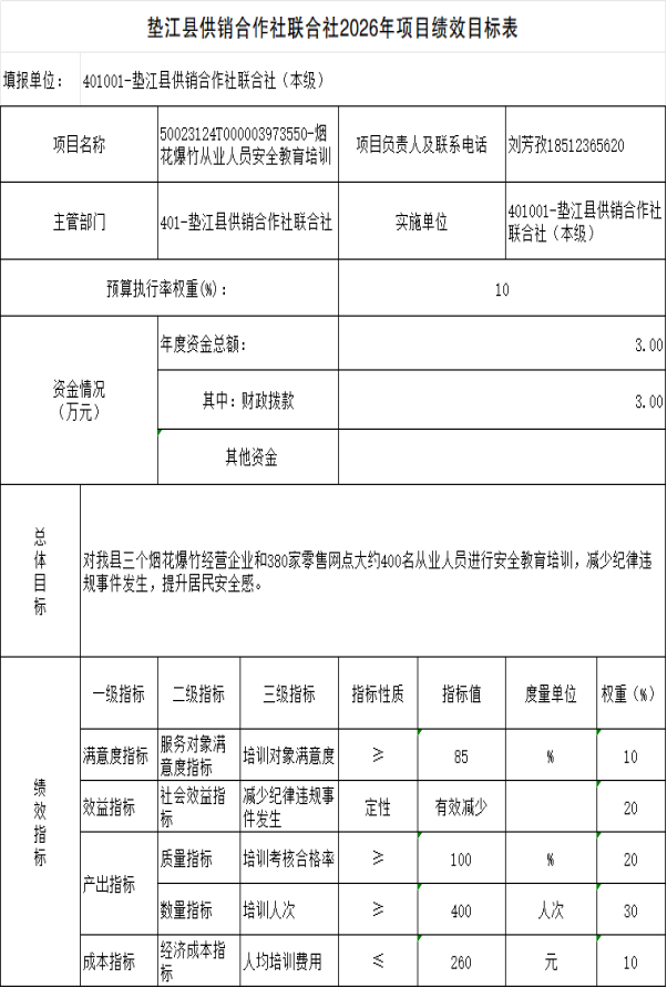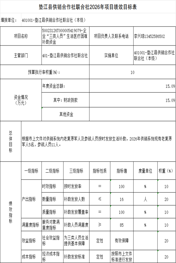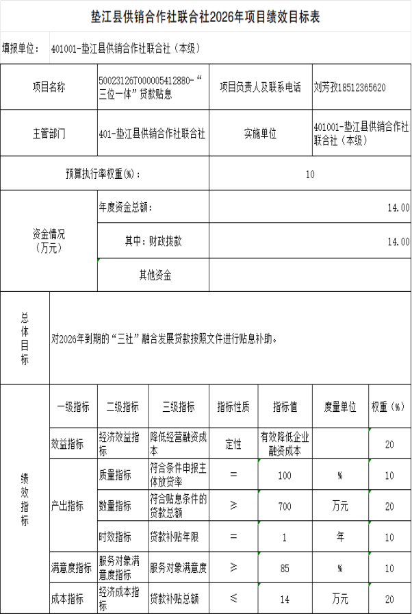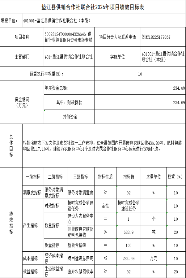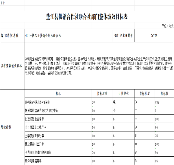 10.垫江县供销合作社联合社2026年部门和单位整体绩效目标表