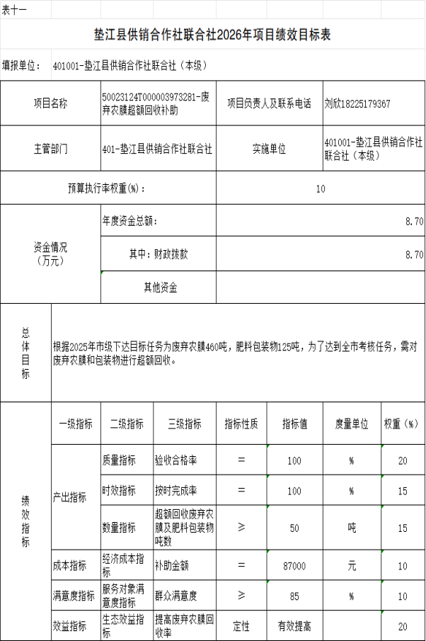 11.垫江县供销合作社联合社2026年项目绩效目标表