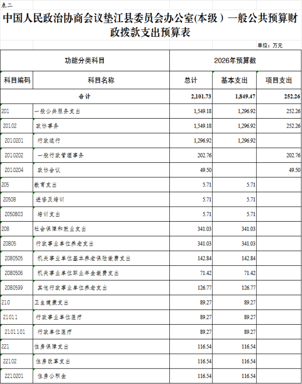 2.中国人民政治协商会议垫江县委员会办公室(本级)一般公共预算财政拨款支出预算表