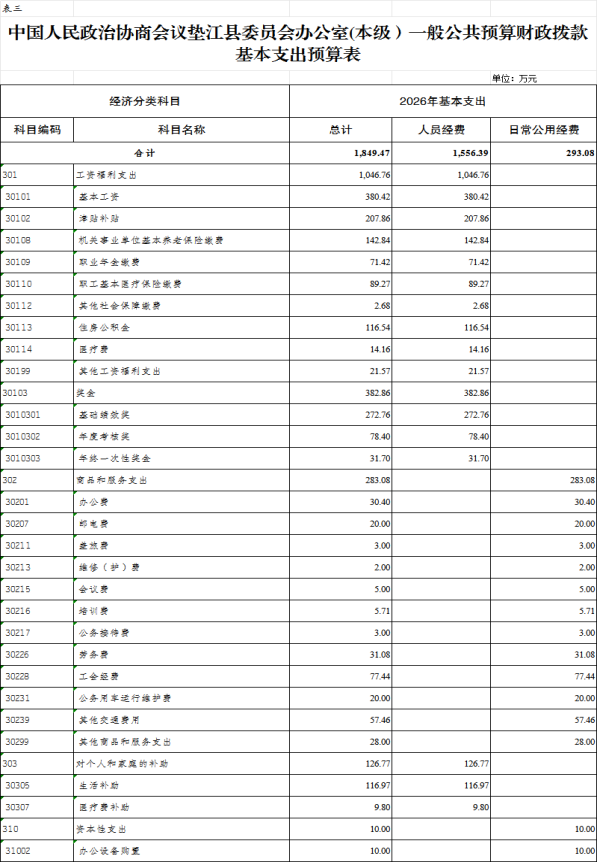3.中国人民政治协商会议垫江县委员会办公室(本级)一般公共预算财政拨款基本支出预算表