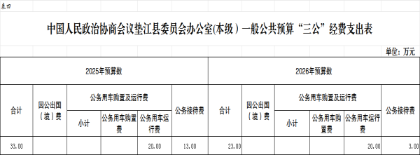2026年“三公”经费预算23.00万元,比2025年减少10.00万元。其中:因公出国(境)费用 0 万元,比2025年减少0万元,主要原因是本单位无该项经费开支;公务接待费3.00万元,比2025年减少10.00万元,主要原因是压缩公务接待预算,全面推行零基预算,减少不必要的接待安排;公务用车运行维护费 20.00万元,比2025年减少0万元,主要原因是财政按编制内公务车辆定额预算,而且这两年标准相同;公务用车购置费0 万元,比2025年减少0万元;主要原因是本单位无该项费用开支。