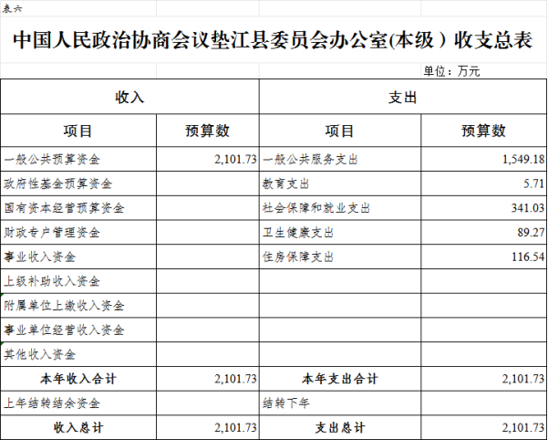 6.中国人民政治协商会议垫江县委员会办公室(本级)收支总表