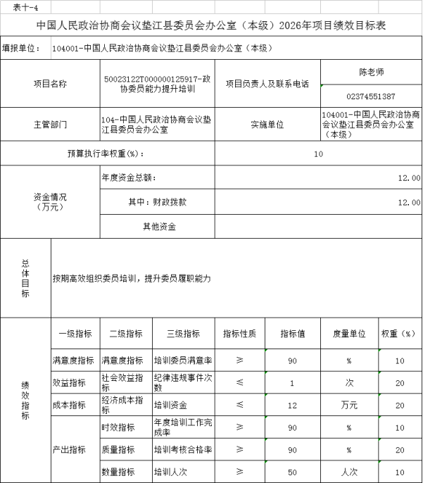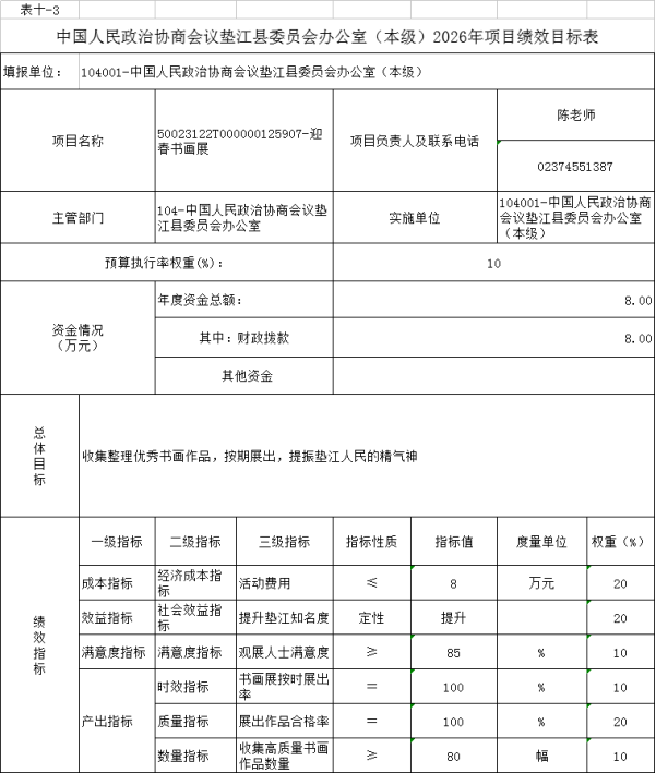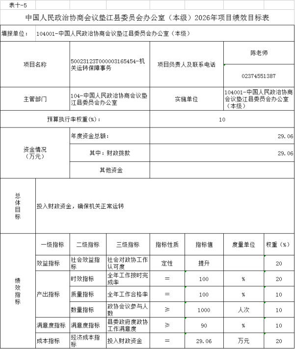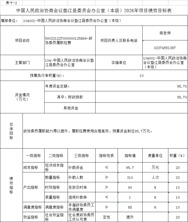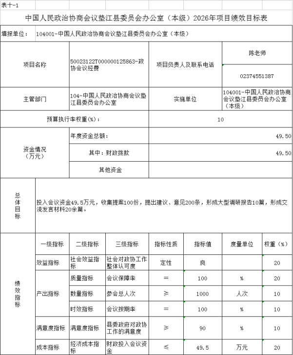 10.中国人民政治协商会议垫江县委员会办公室(本级)2026年项目绩效目标表