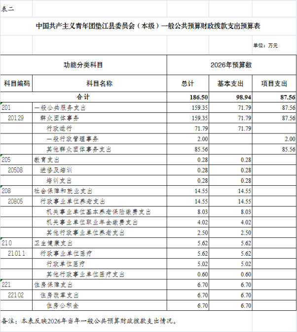 2026年一般公共预算财政拨款收入186.5万元,一般公共预算财政拨款支出186.5万元,比2025年减少184.76万元。其中:基本支出98.94万元,比2025年增加5.7万元,主要原因是2026年年初政策性调整预算增加,主要用于保障中国共产主义青年团垫江县委员会在职人员工资福利及社会保险缴费、离休人员离休费、退休人员补助等,保障部门正常运转的各项商品服务支出;项目支出87.56万元,比2025年减少190.46万元,主要原因是大学生志愿服务西部计划专项经费拨款减少177万元,群团事业发展专项减少5万元。主要用于保障2026年大学生志愿服务西部计划志愿者的生活补助和社保缴费、群团组织建设等重点工作。