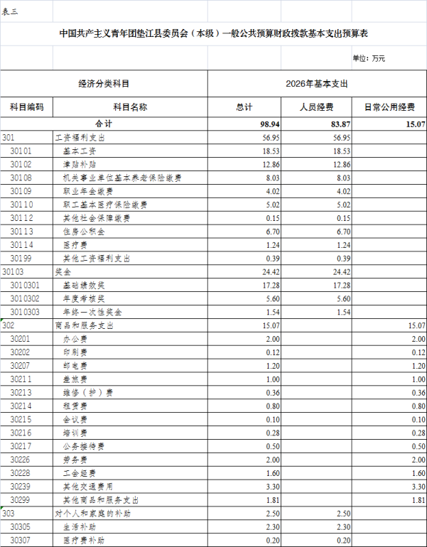 3.中国共产主义青年团垫江县委员会(本级)一般公共预算财政拨款基本支出预算表