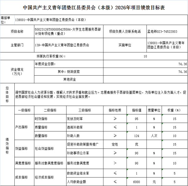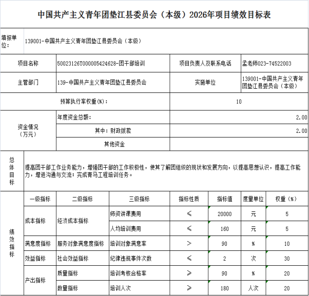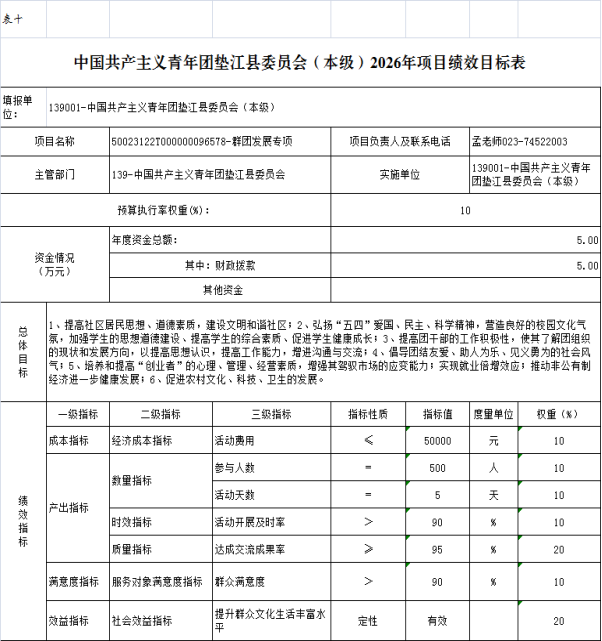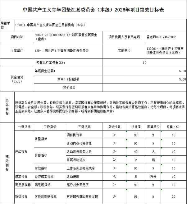 10.中国共产主义青年团垫江县委员会(本级)2026年项目绩效目标表
