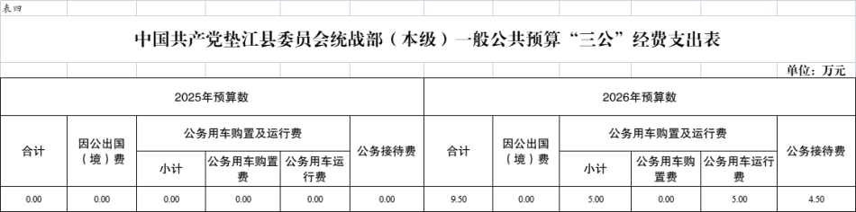 2026年“三公”经费预算9.50万元,比2025年增加9.50万元。其中:因公出国(境)费用0万元,比2025年减少0万元,主要原因是无因公出国(境)的支出;公务接待费4.50万元,比2025年增加4.50万元,主要原因是根据工作需要增加公务接待费;公务用车运行维护费5.00万元,比2025年增加5.00万元,主要原因是根据工作需要增加公车运行维护费;公务用车购置费0万元,比2025年减少0万元;主要原因是无公务用车购置的支出。