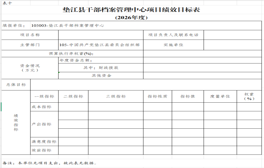 (三)绩效目标设置情况。2026年垫江县干部档案管理中心无项目支出预算,涉及一般公共预算当年财政拨款0万元。