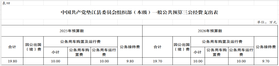 2026年“三公”经费预算19.70万元,比2025年减少0.10万元。其中:因公出国(境)费用0万元,比2025年增加0万元,主要原因是本单位2026年无因公出国(境)工作安排;公务接待费9.70万元,比2025年减少0.10万元,主要原因是贯彻落实中央八项规定精神,压减支出;公务用车运行维护费10.00万元,较2025年无增减变化;公务用车购置费0万元,比2025年增加0万元;主要原因是本单位2026年无公务用车购置打算。