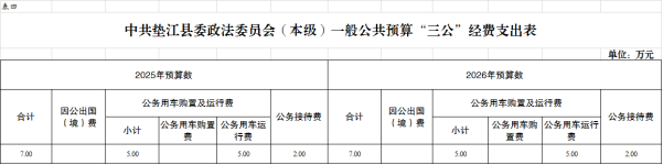 2026年“三公”经费预算7.00万元,比2025年减少0万元。其中:因公出国(境)费用0万元,比2025年减少0万元,主要原因是无因公出国(境)安排;公务接待费2.00万元,比2025年减少0万元,主要原因是厉行节约压减支出,用于打造平安垫江、信访维稳、维护政治安全等专项工作的督导检查;公务用车运行维护费5.00万元,比2025年减少0万元,主要原因是严格执行中央八项规定精神,坚持严格规范,科学管理,保障运行,厉行节约为原则;公务用车购置费0万元,比2025年减少0万元;主要原因是本单位无公车购置计划。