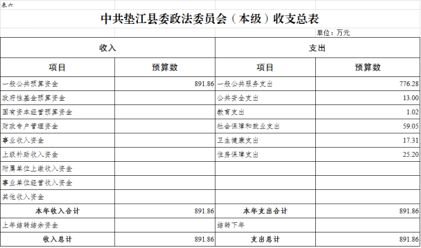2026年一般公共预算财政拨款收入891.86万元,一般公共预算财政拨款支出891.86万元,比2025年减少381.46万元。其中:基本支出596.04万元,比2025年增加增加143.72万元,主要原因是人员经费增加及购买服务人员政法社工整合增加20人劳务费,主要用于保障在职人员工资福利及社会保险缴费、离休人员离休费、退休人员补助等,保障部门正常运转的各项商品服务支出;项目支出295.82万元,比2025年减少525.18万元,主要原因是将部分划拨至乡镇(街道)经费提前下达以及厉行节约压减支出,重点压减非急需、非刚性的支出,主要用于平安建设、政治安全、维护社会稳定等重点工作。