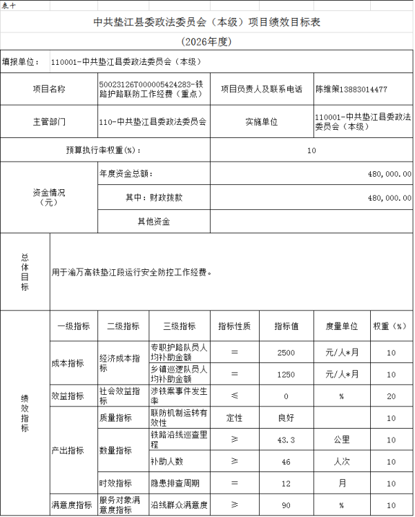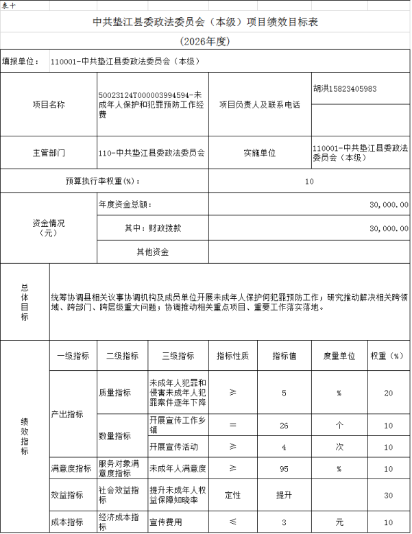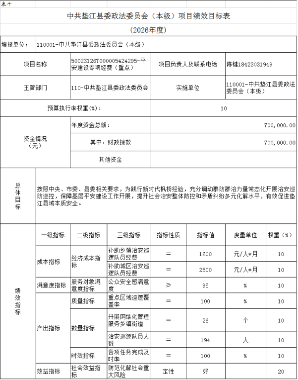 10.中共垫江县委政法委员会(本级)2026年项目绩效目标表