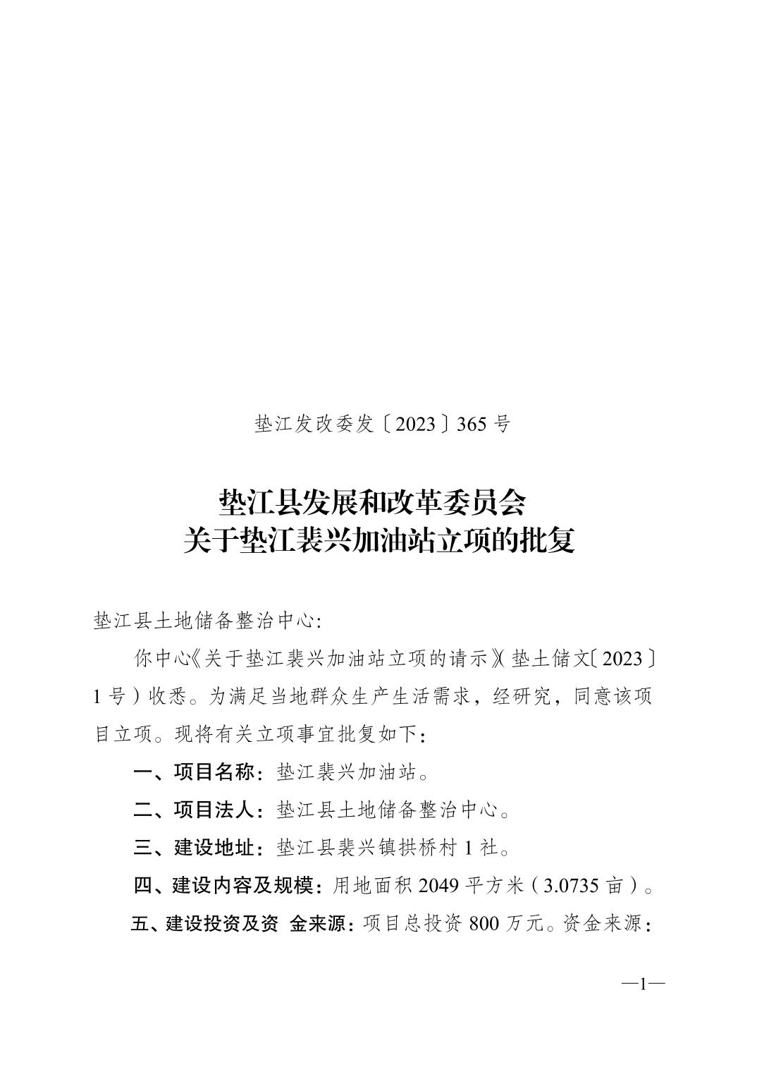 垫江县发展和改革委员会关于垫江裴兴加油站立项的批复