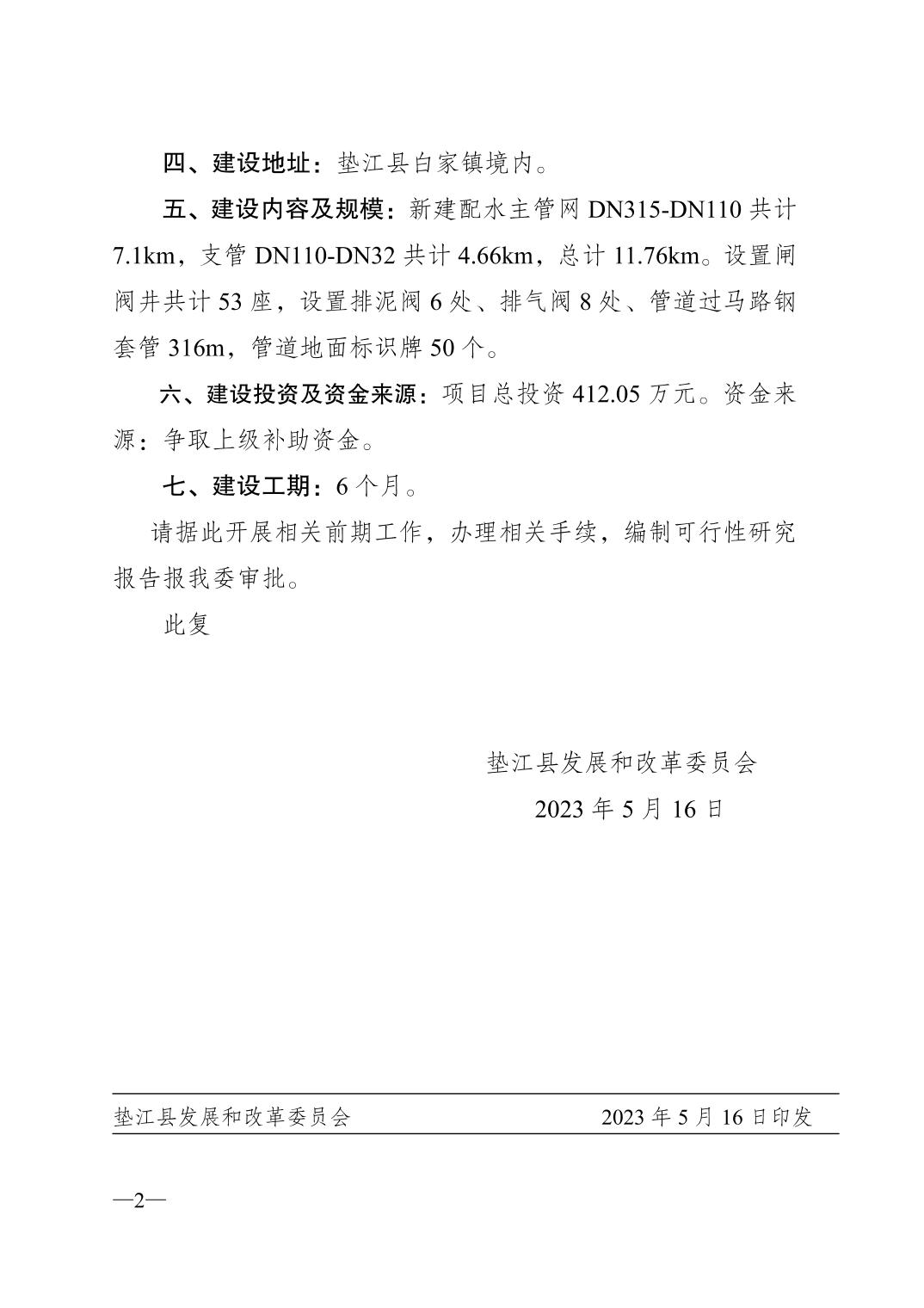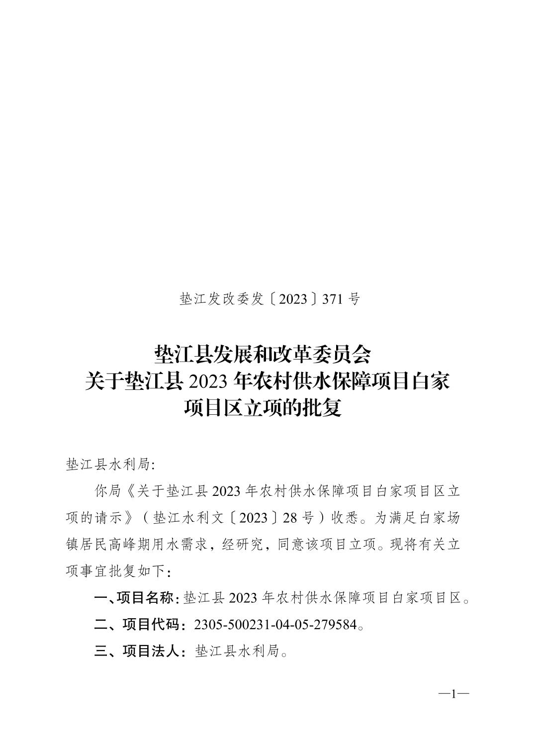 垫江县发展和改革委员会关于垫江县2023年农村供水保障项目白家项目区立项的批复