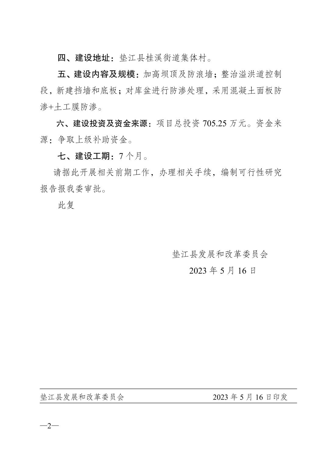 垫江县发展和改革委员会关于垫江县白龙洞水库除险加固工程立项的批复