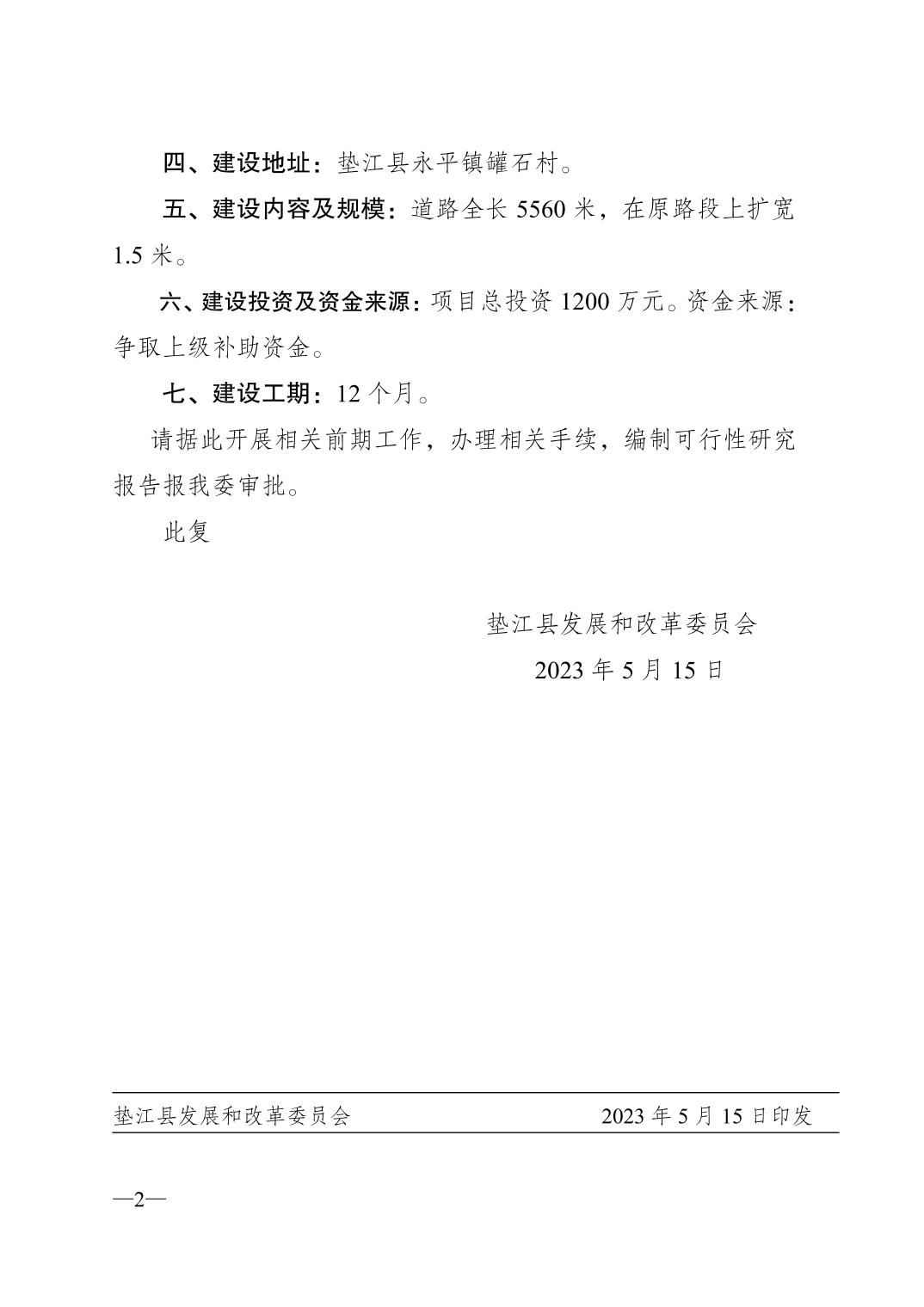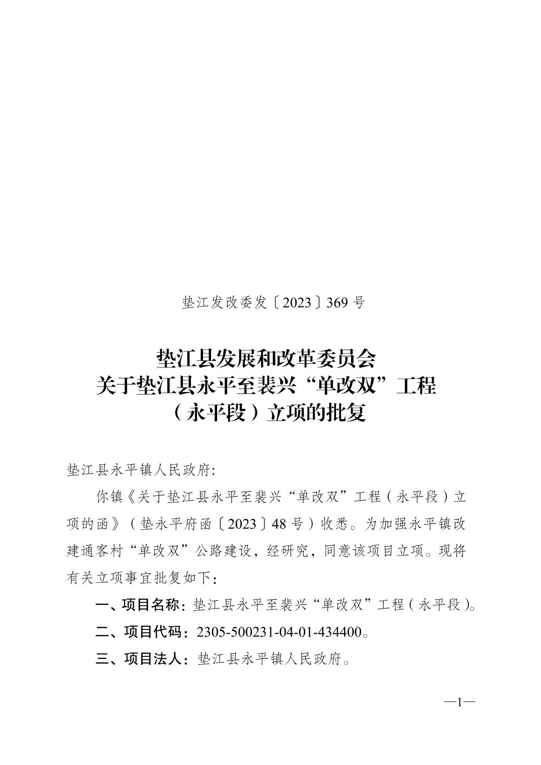 垫江县发展和改革委员会关于垫江县永平至裴兴“单改双”工程(永平段)立项的批复
