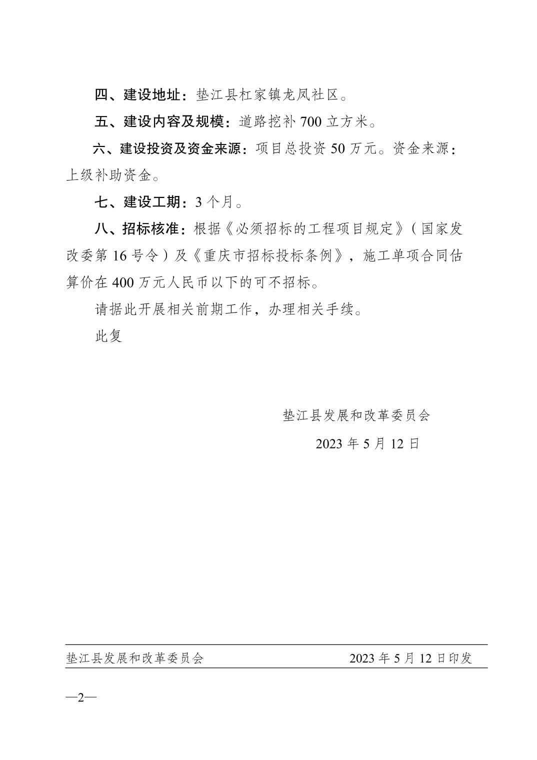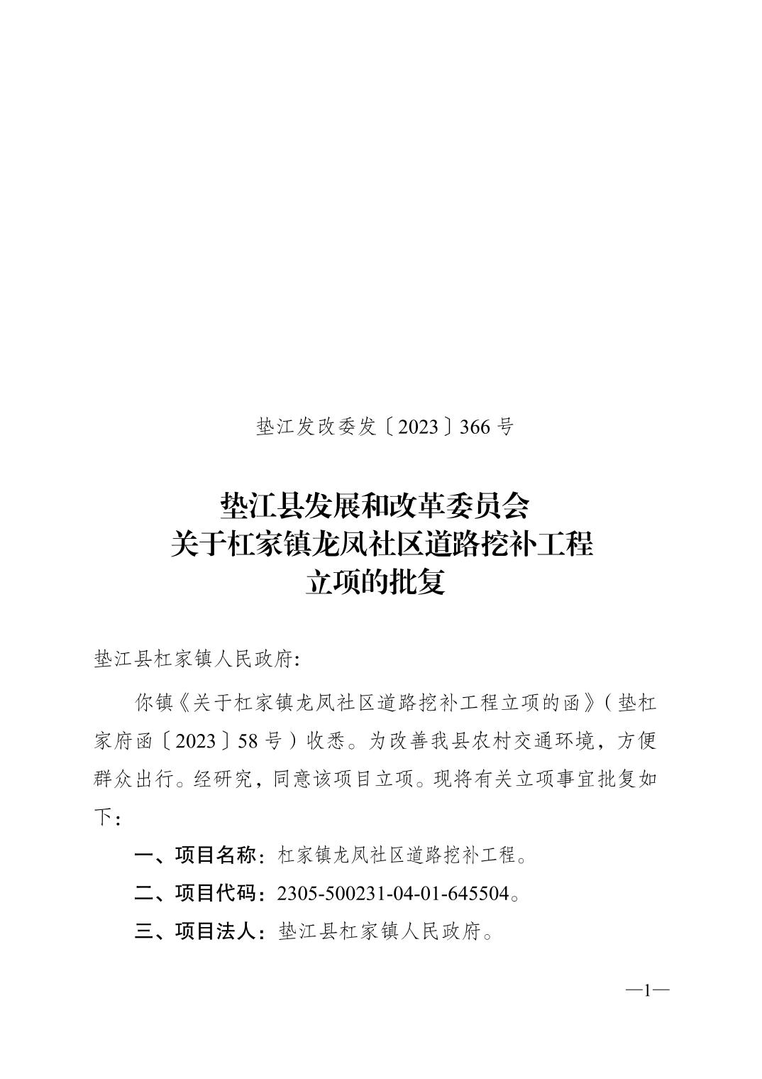 垫江县发展和改革委员会关于杠家镇龙凤社区道路挖补工程立项的批复