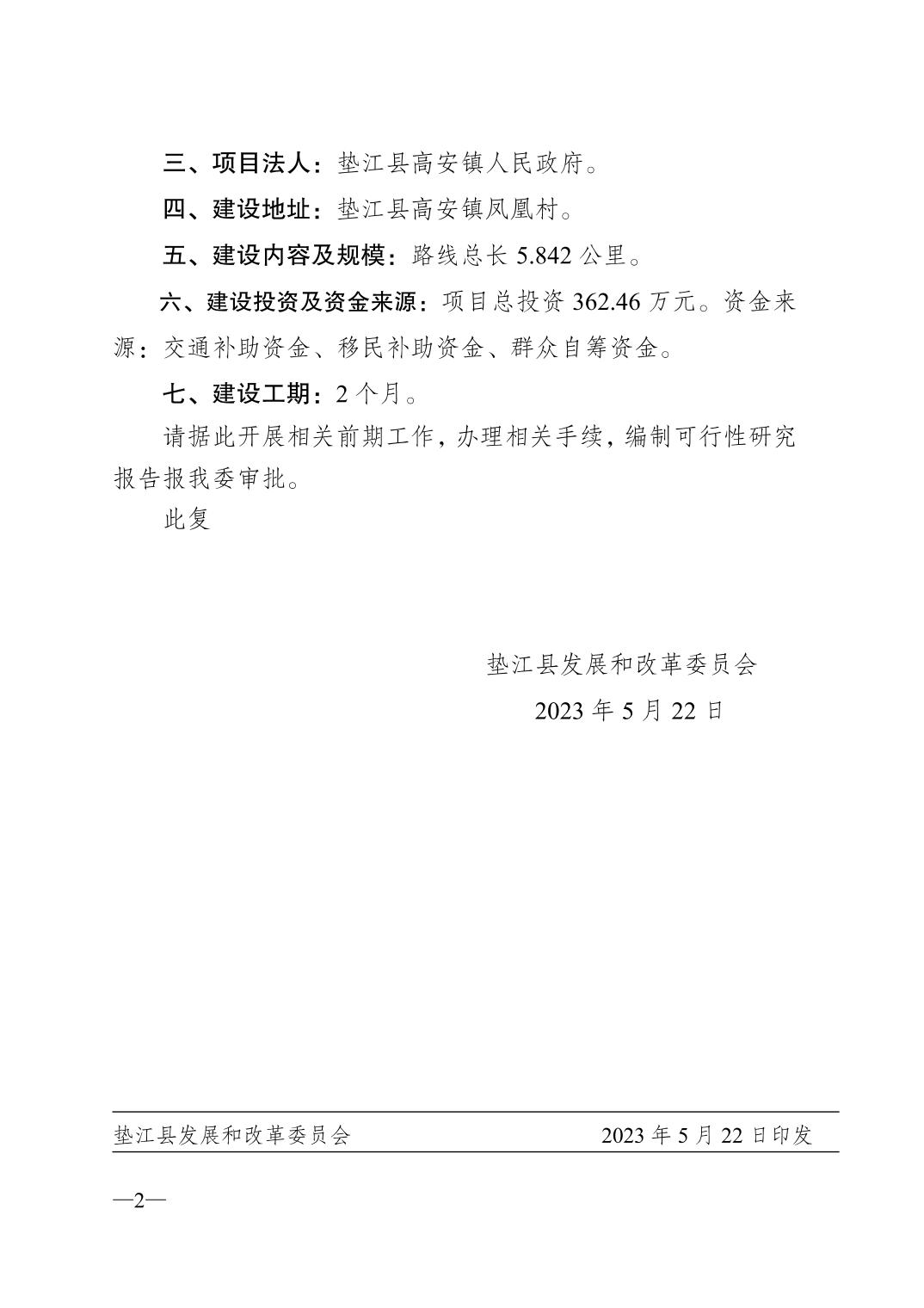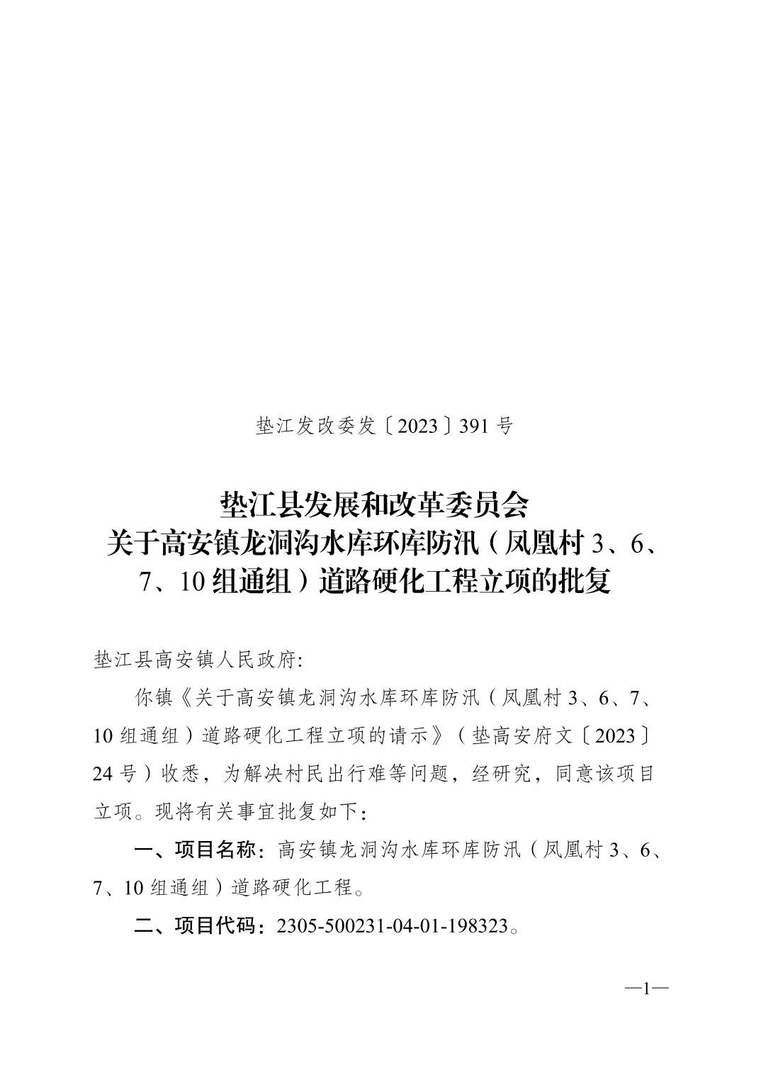 垫江县发展和改革委员会关于高安镇龙洞沟水库环库防汛(凤凰村3、6、7、10组通组)道路硬化工程立项的批复