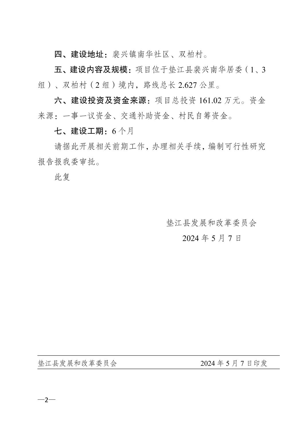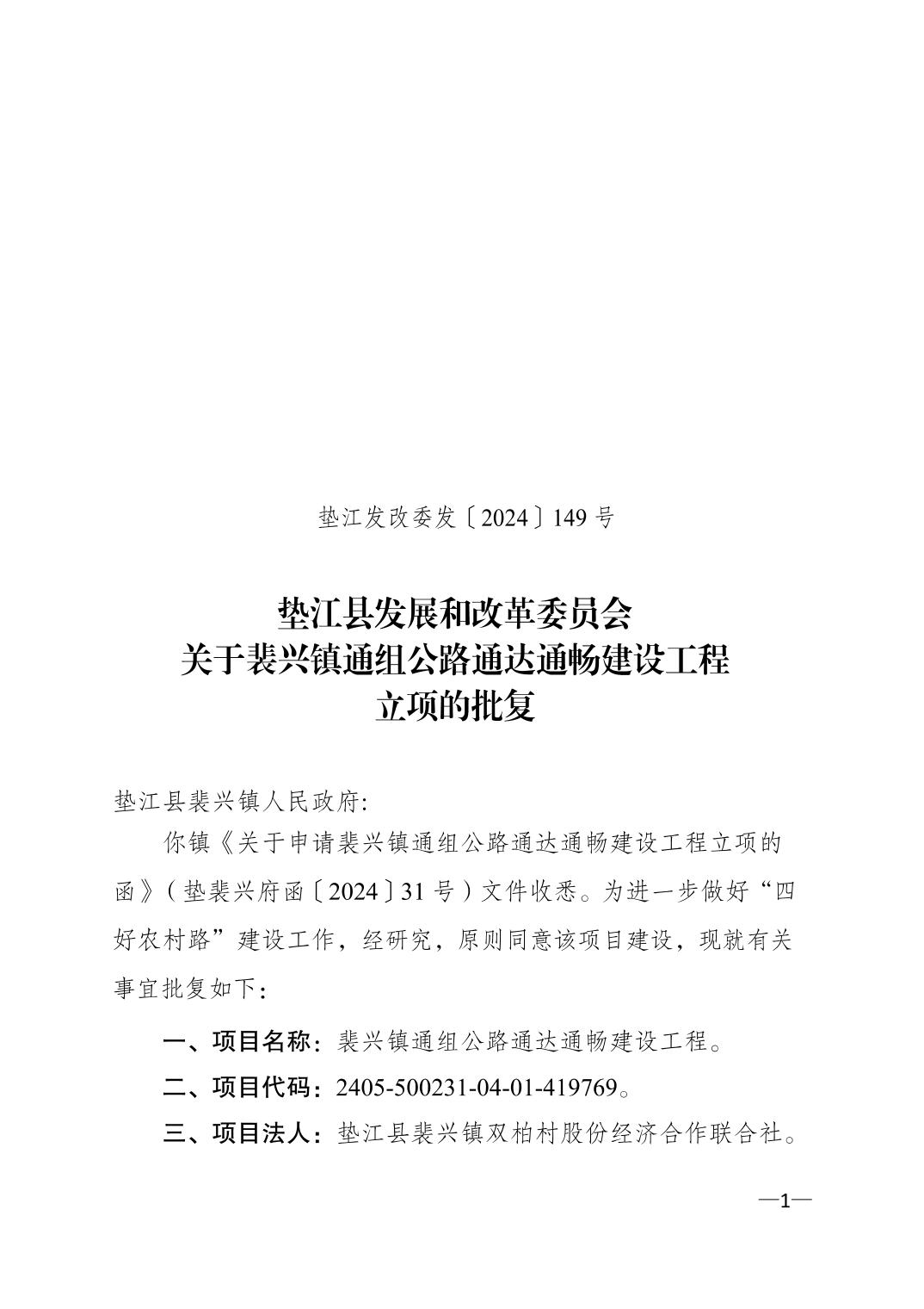 垫江县发展和改革委员会关于裴兴镇通组公路通达通畅建设工程立项的批复