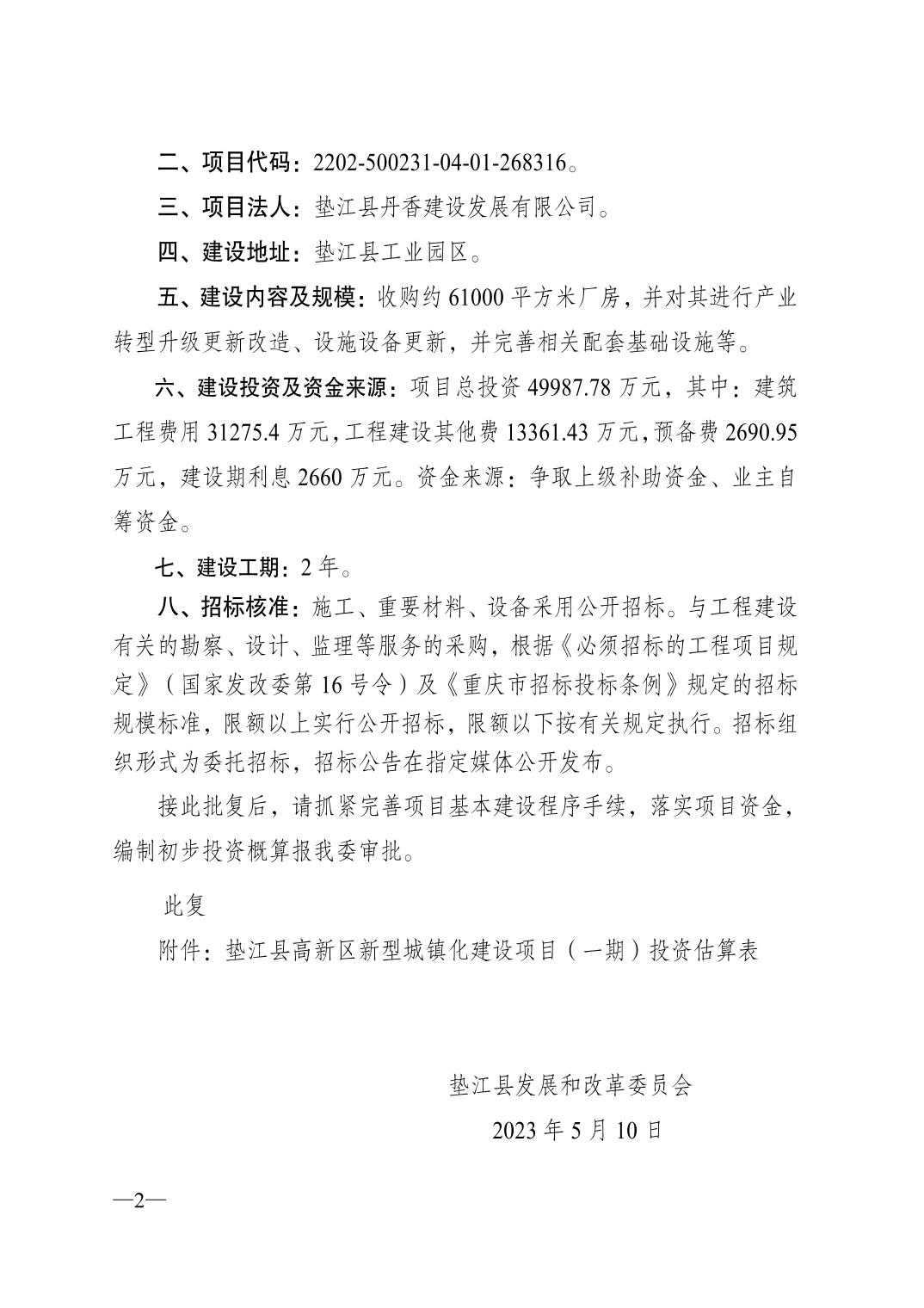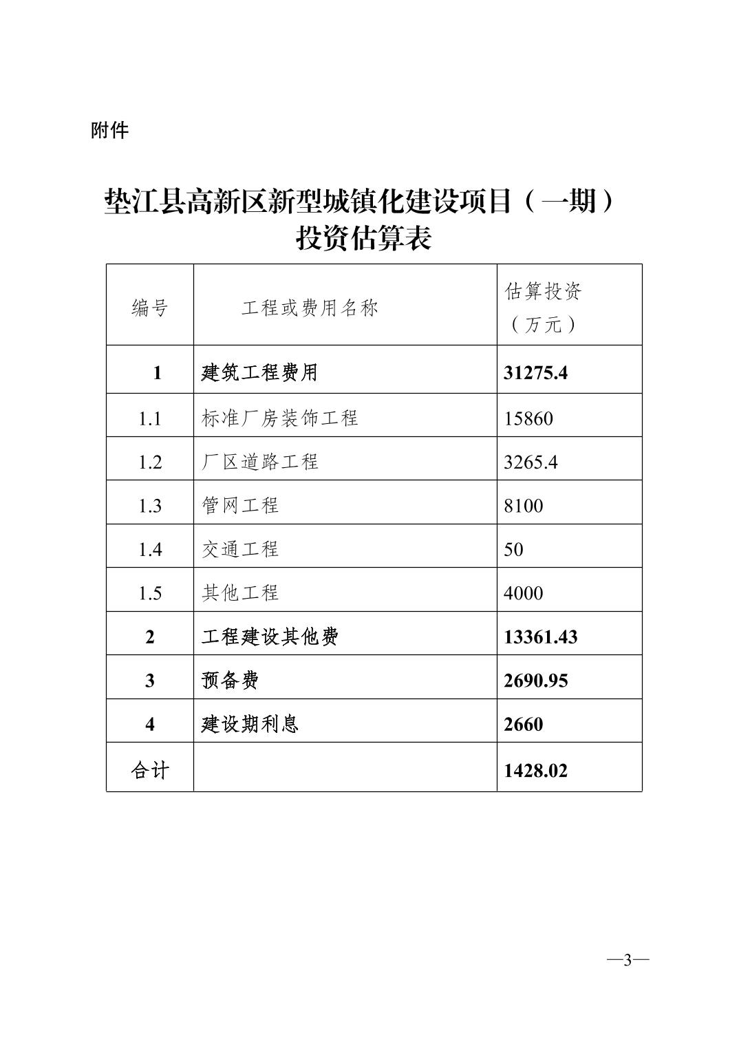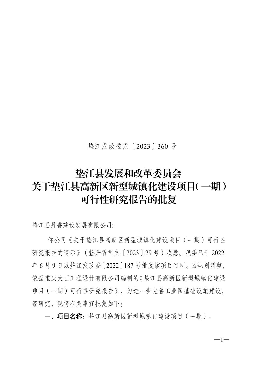 垫江县发展和改革委员会关于垫江县高新区新型城镇化建设项目(一期)可行性研究报告的批复