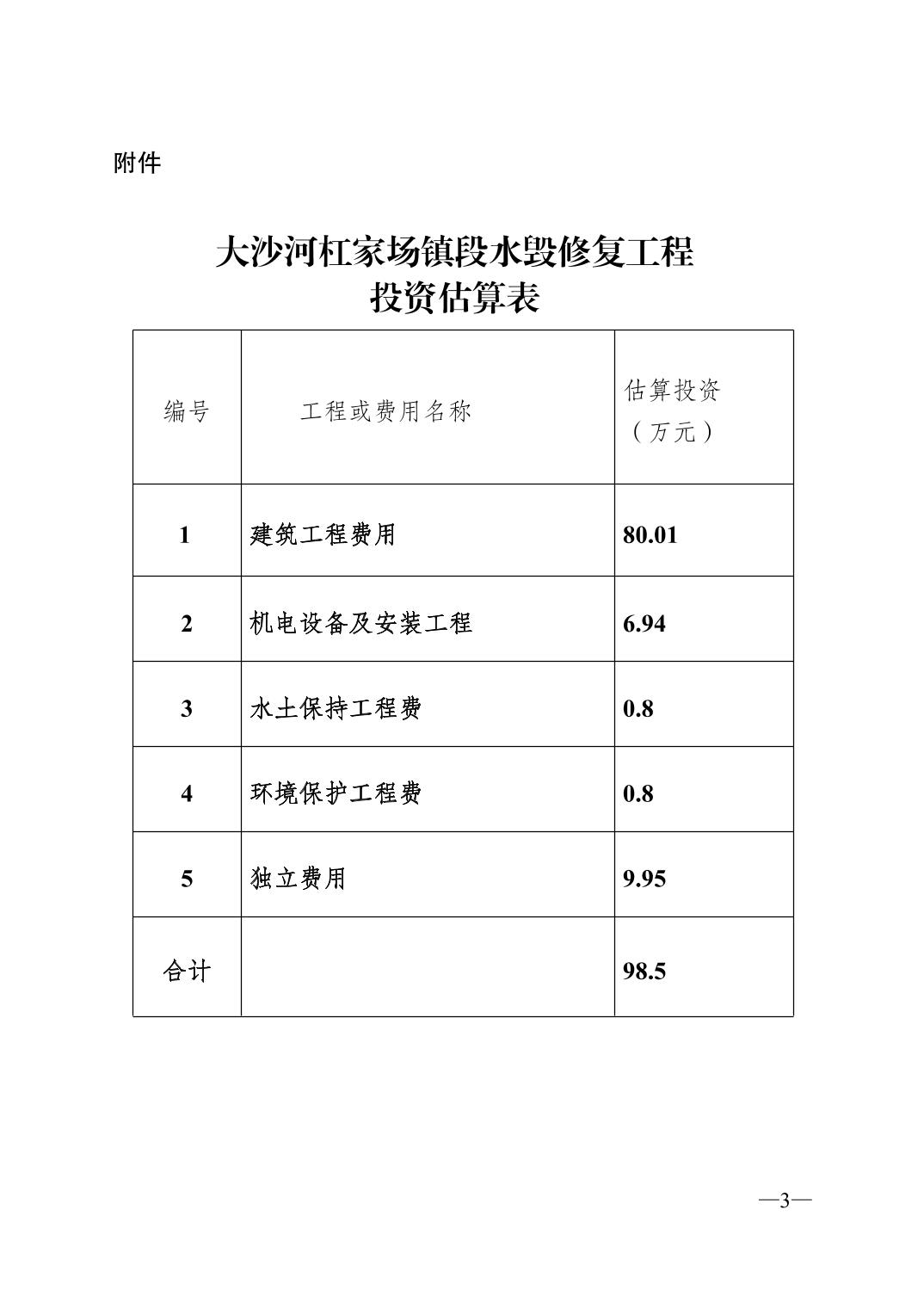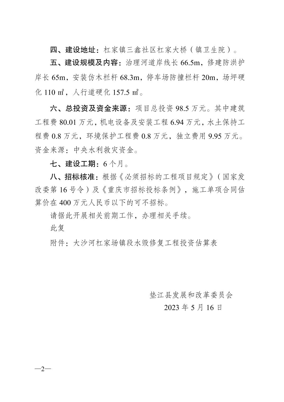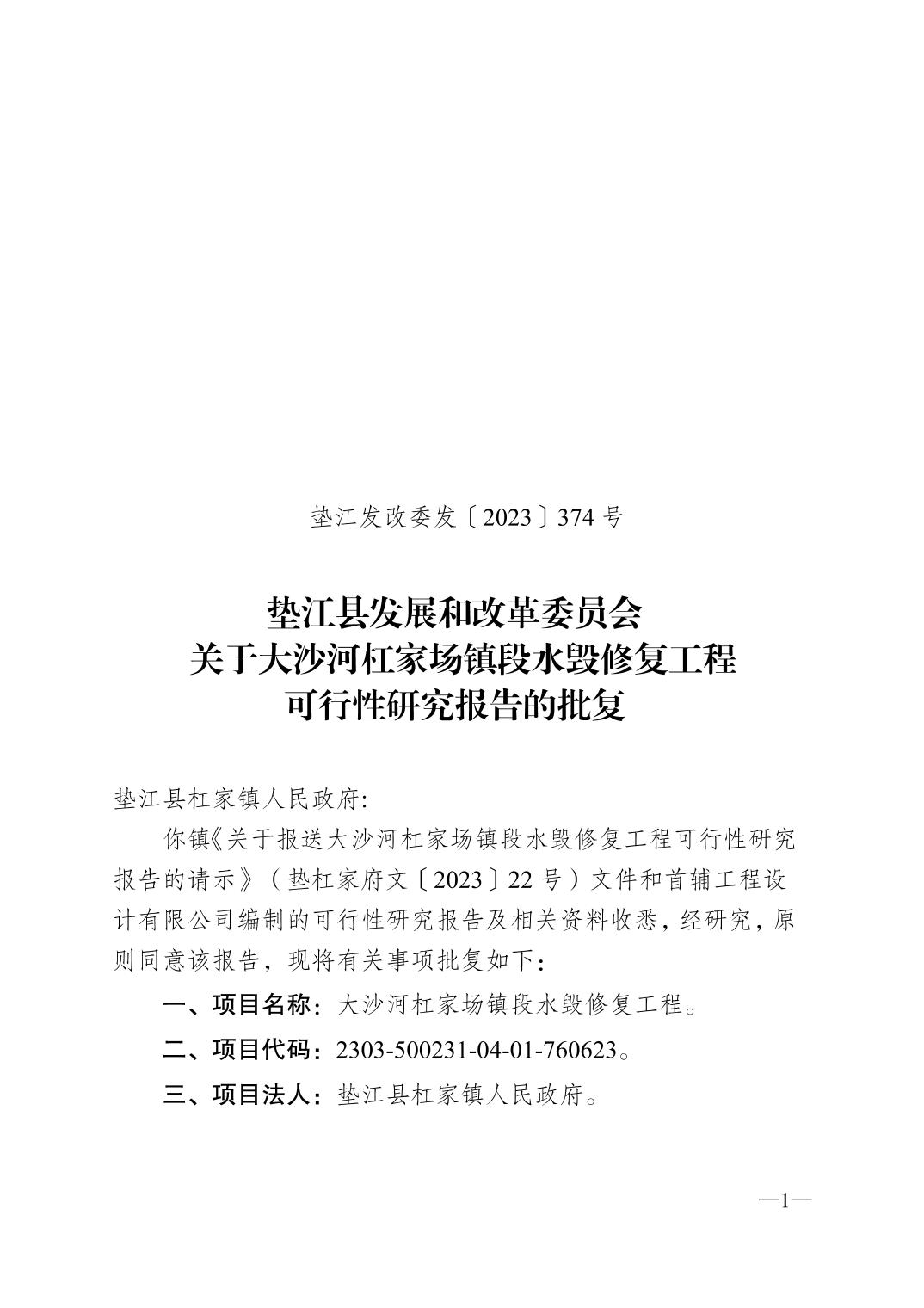 垫江县发展和改革委员会关于大沙河杠家场镇段水毁修复工程可行性研究报告的批复