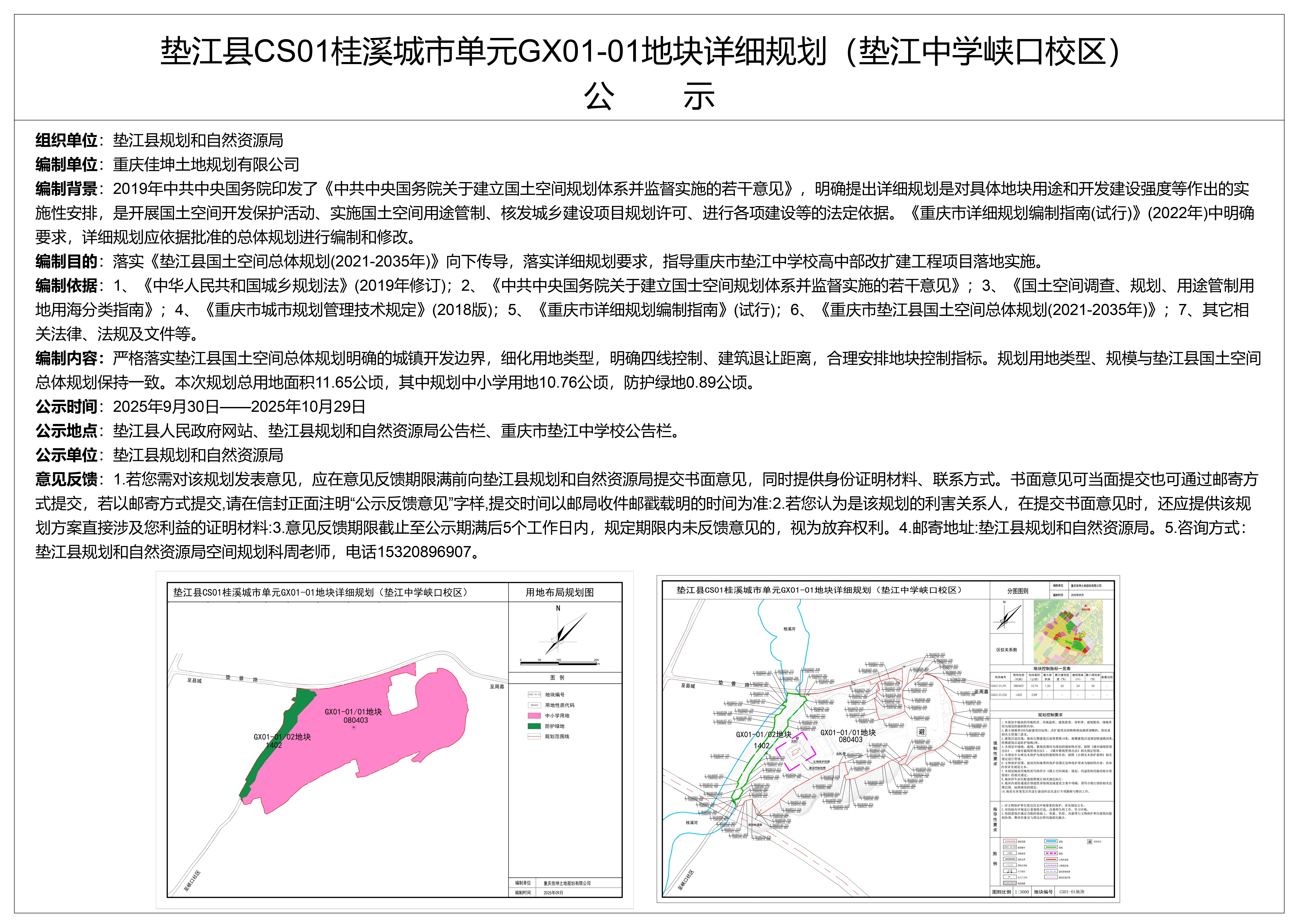 垫江县CS01桂溪城市单元GX01-01地块详细规划(垫江中学峡口校区)公示