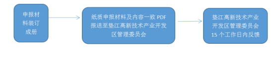 答:符合条件的企业或单位,按要求准备申报材料并装订成册(一式两份)。将纸质申报材料及内容一致的PDF电子版,报送至垫江高新技术产业开发区管理委员会。高新区管委会在受理项目后15个工作日内完成审核,并对审核未通过的项目及时反馈理由。