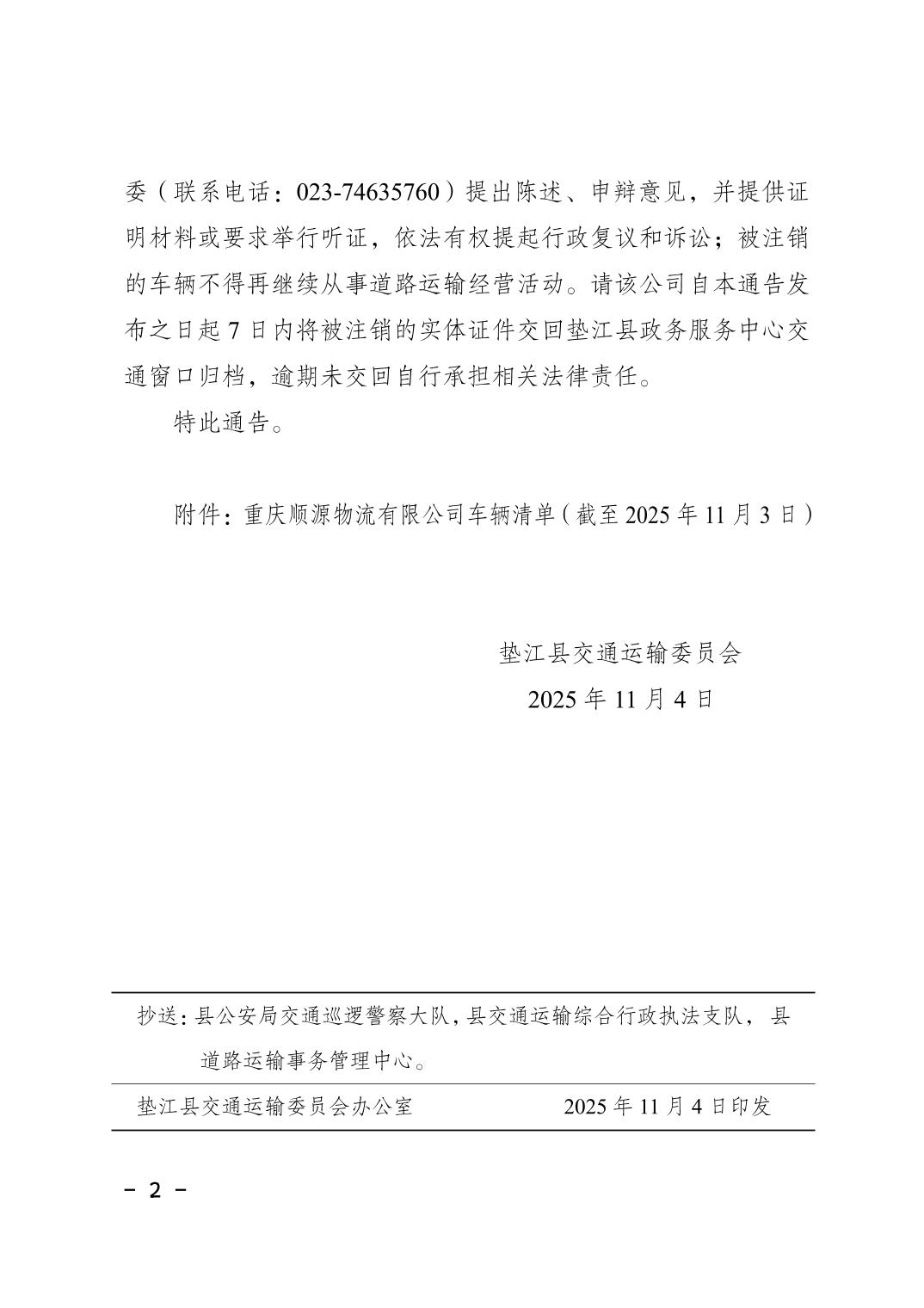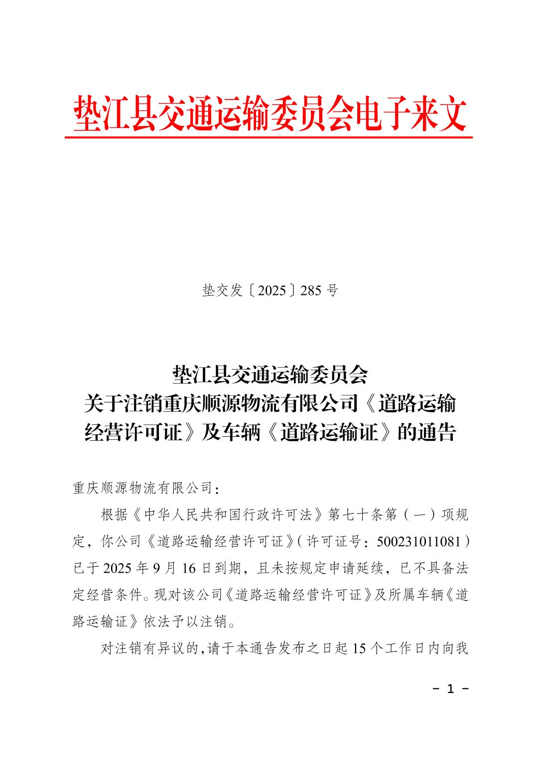 垫江县交通运输委员会关于注销重庆顺源物流有限公司《道路运输经营许可证》及车辆《道路运输证》的通告