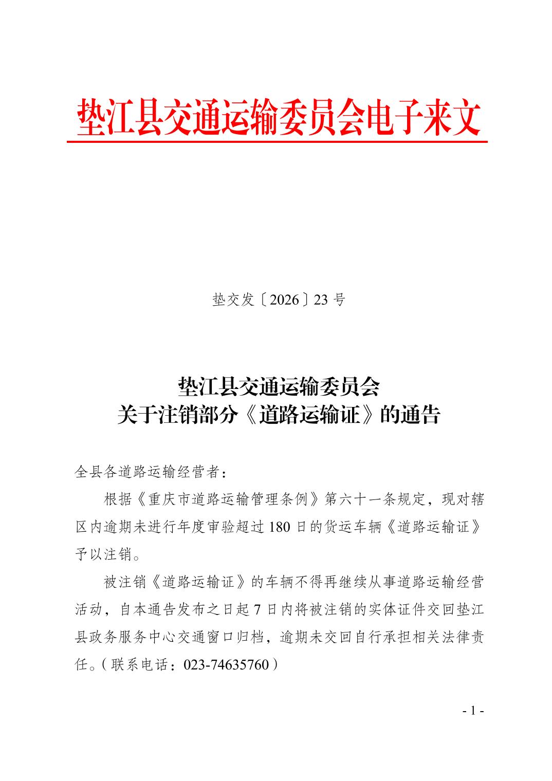 垫江县交通运输委员会关于注销部分《道路运输证》的通告