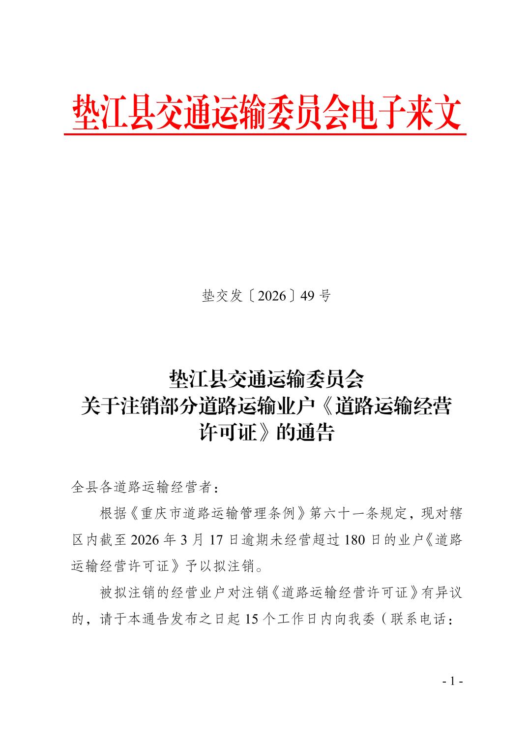 垫江县交通运输委员会关于注销部分道路运输业户《道路运输经营许可证》的通告