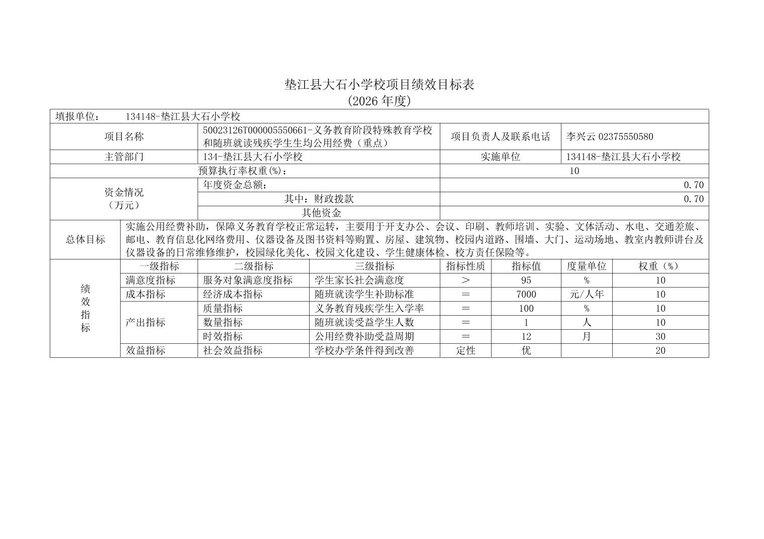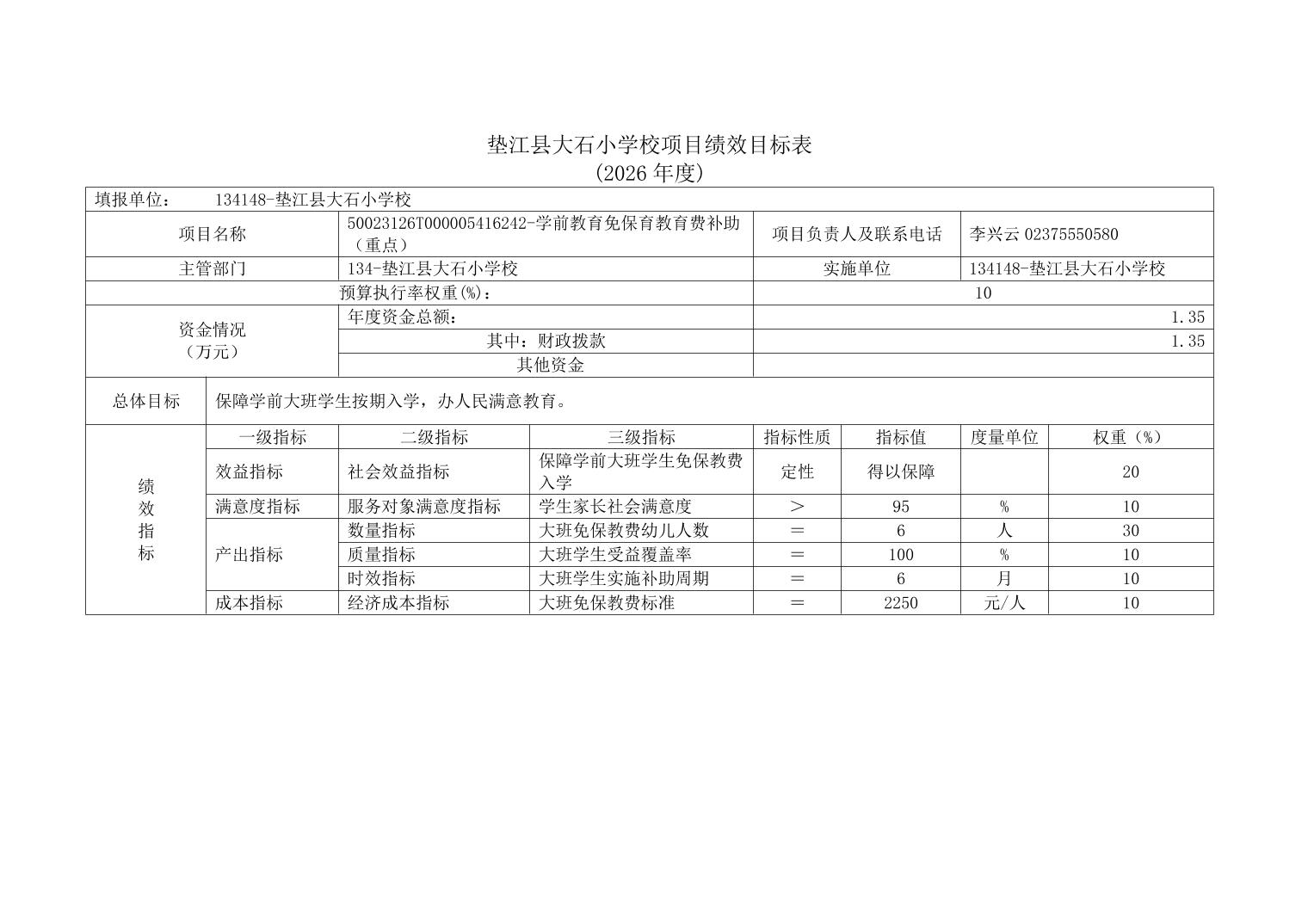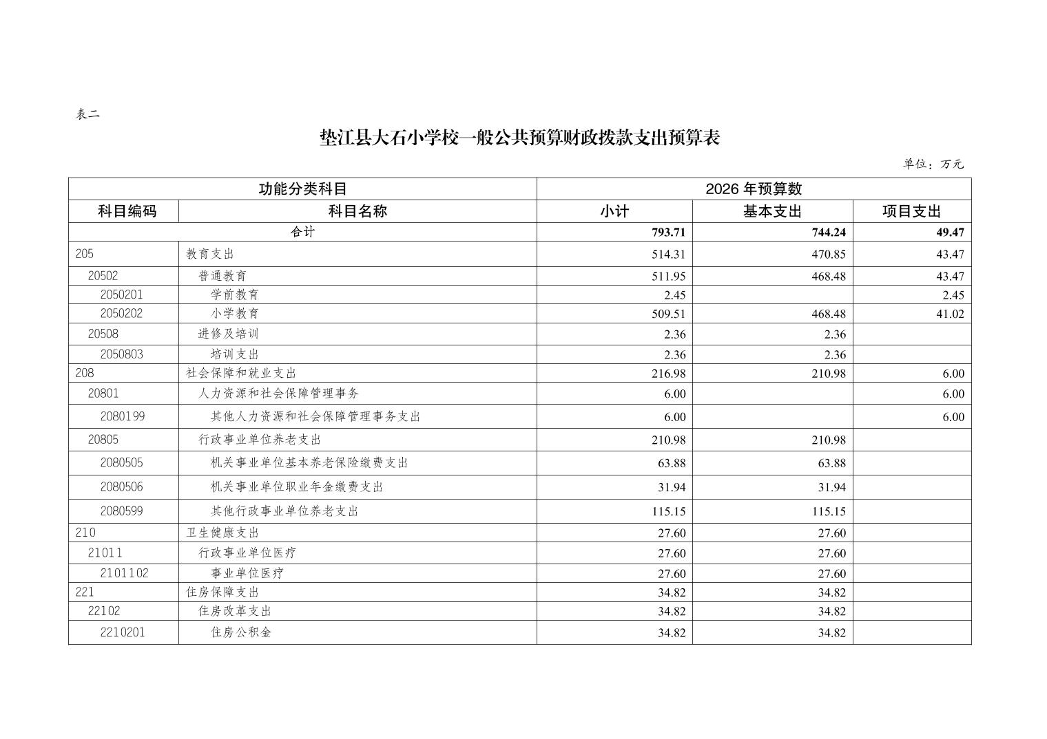 垫江县大石小学校2026年单位预算情况说明
