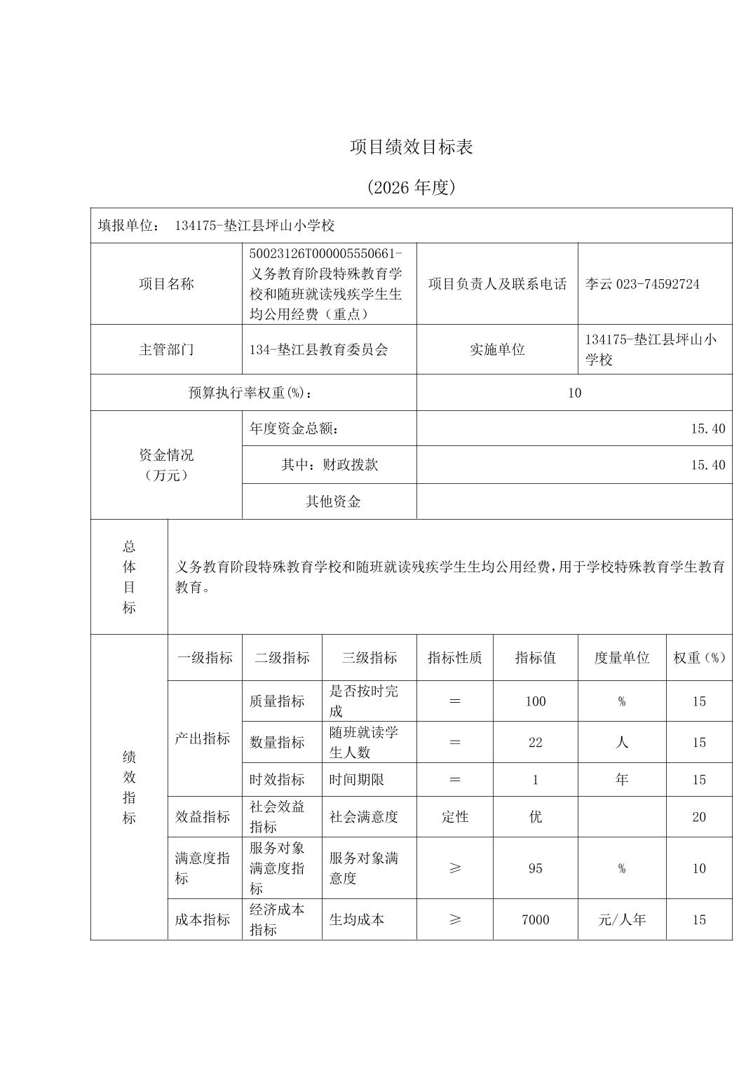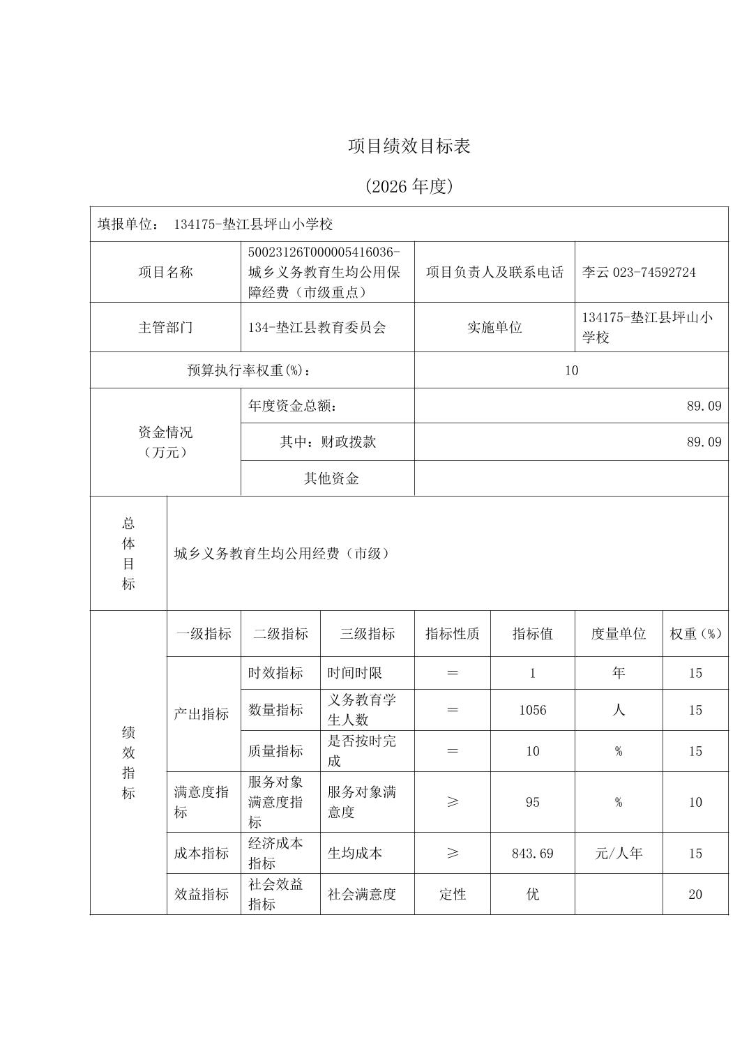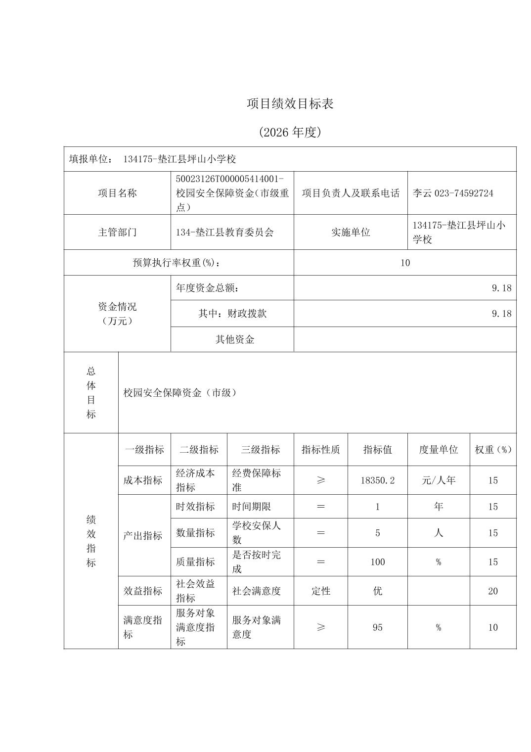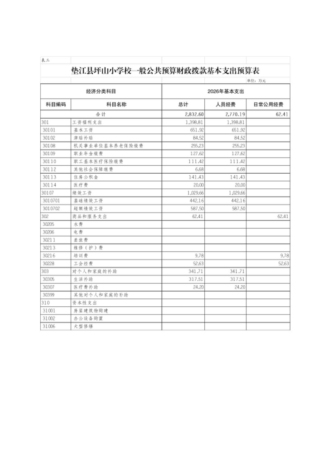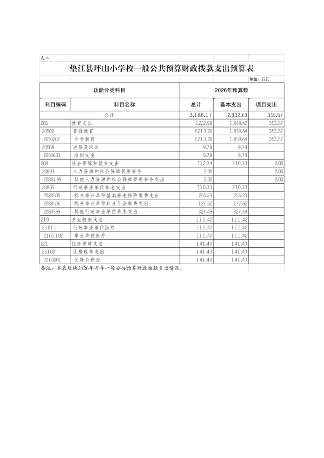 垫江县坪山小学校2026年单位预算情况说明
