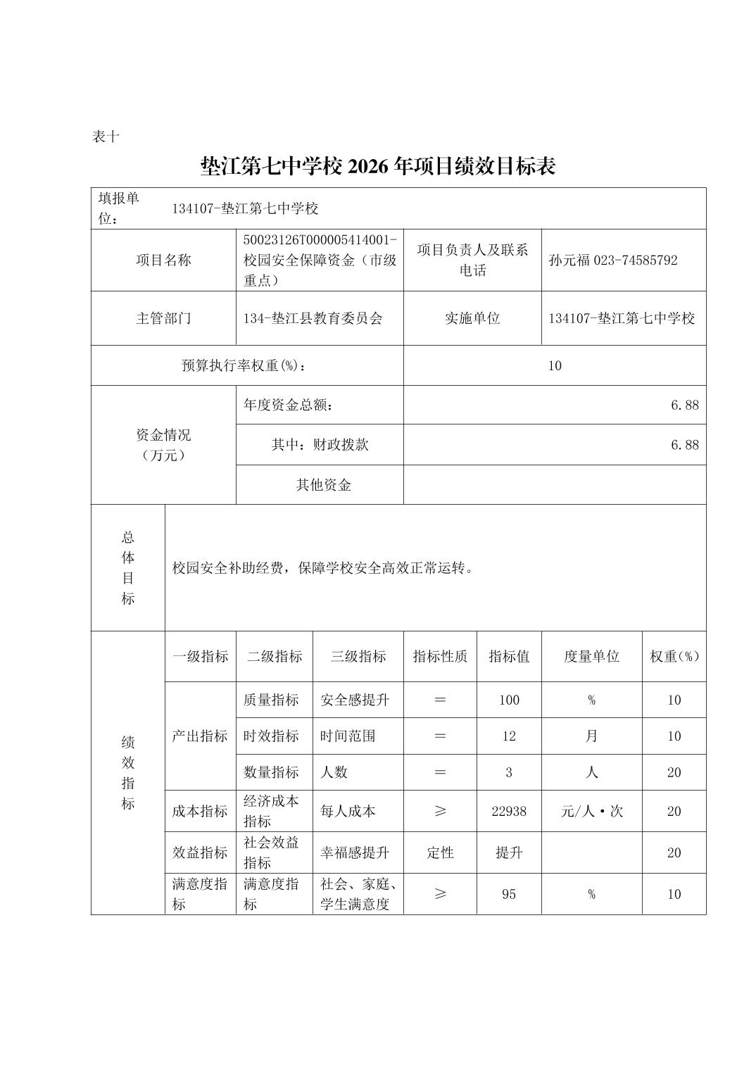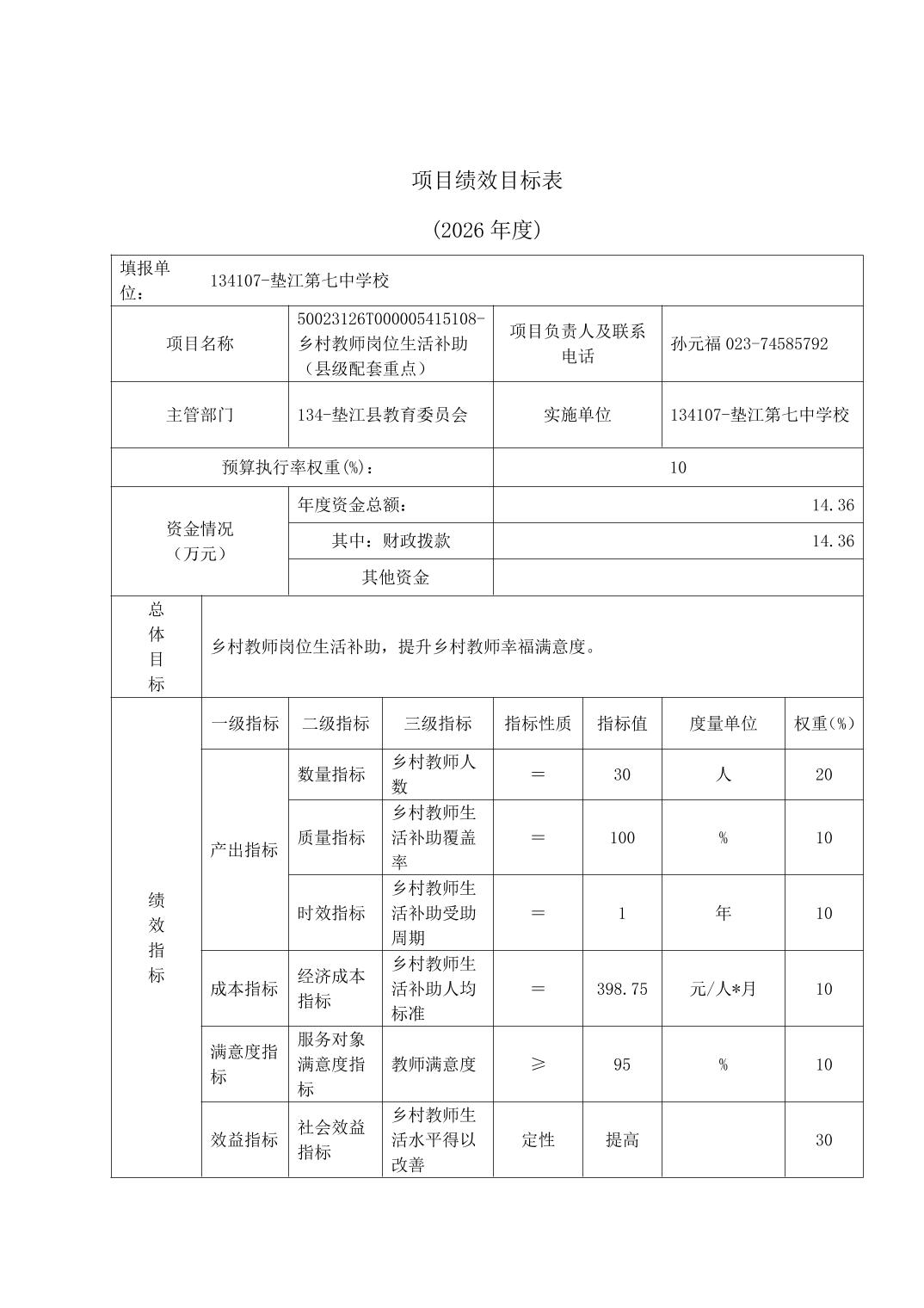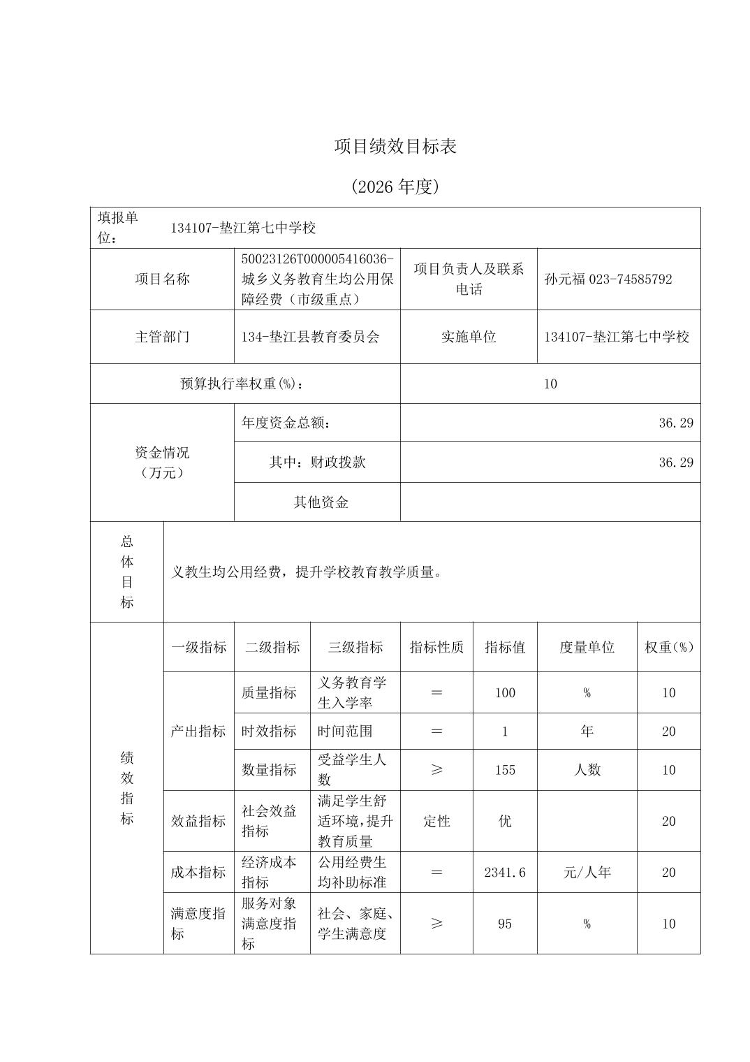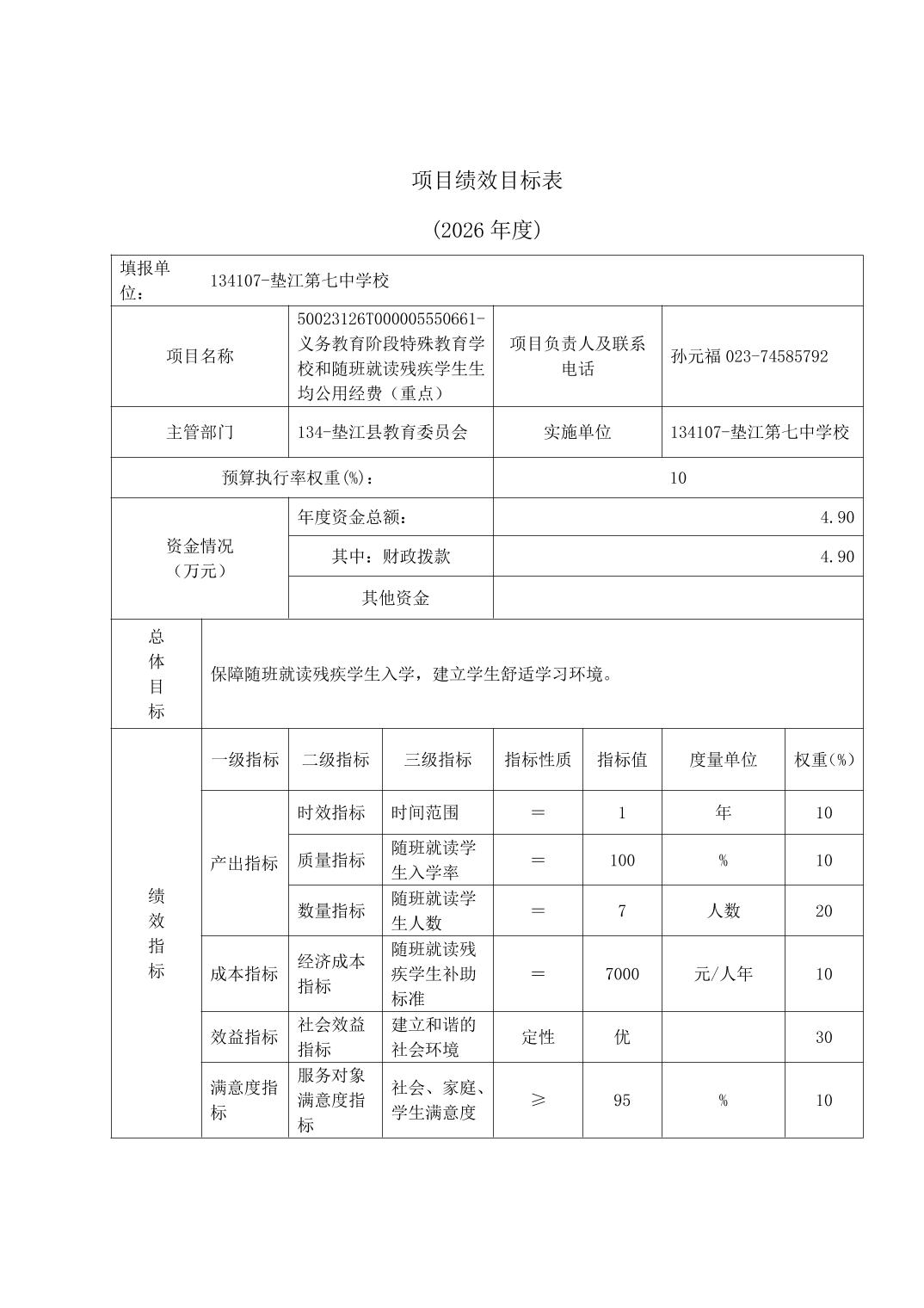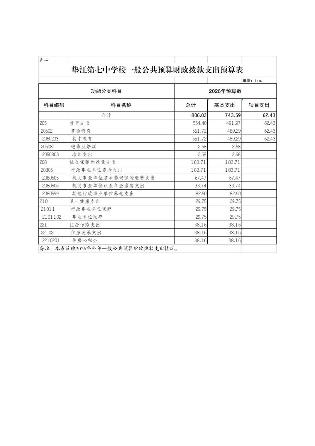 垫江第七中学校2026年单位预算情况说明